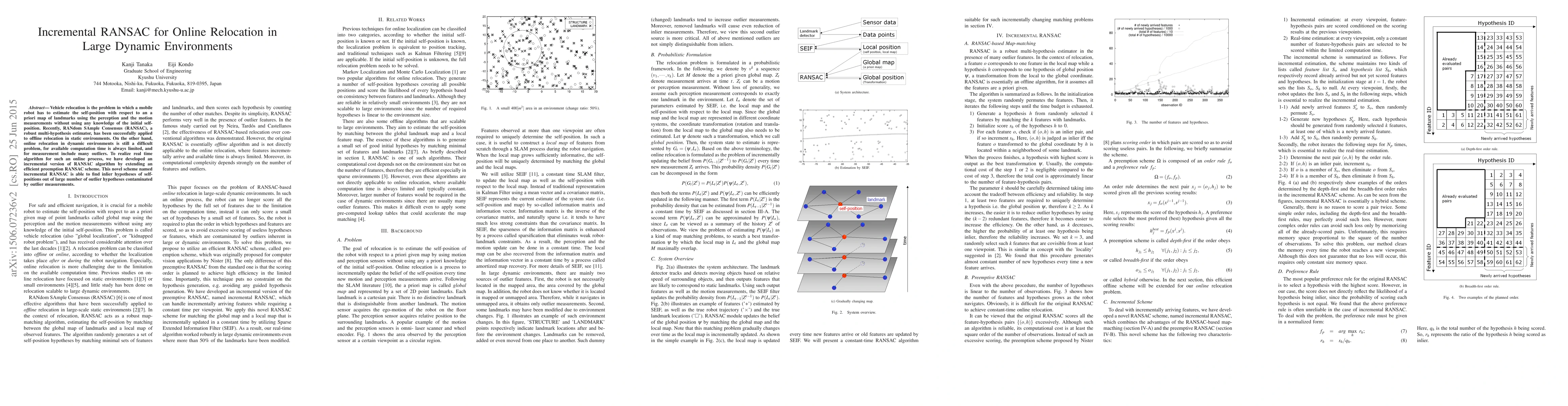 Vehicle relocation is the problem in which a mobile robot has to estimate the self-position with respect to an a priori map of landmarks using the perception and the motion measurements without using any knowledge of the initial self-position. Recently, RANdom SAmple Consensus (RANSAC), a robust multi-hypothesis estimator, has been successfully applied to offline relocation in static environments. On the other hand, online relocation in dynamic environments is still a difficult problem, for available computation time is always limited, and for measurement include many outliers. To realize real time algorithm for such an online process, we have developed an incremental version of RANSAC algorithm by extending an efficient preemption RANSAC scheme. This novel scheme named incremental RANSAC is able to find inlier hypotheses of self-positions out of large number of outlier hypotheses contaminated by outlier measurements.