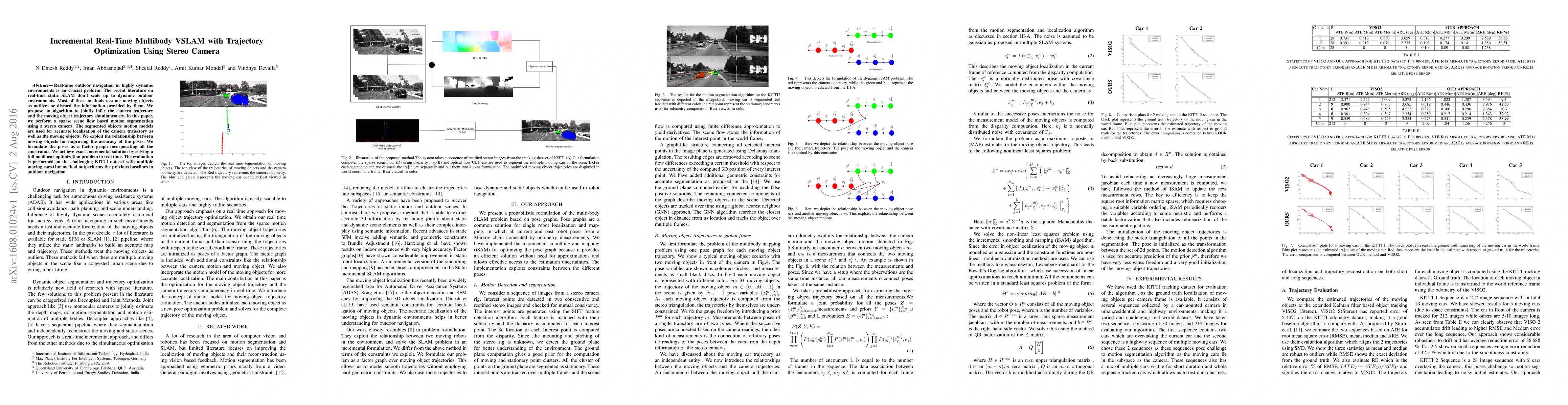 This paper proposes an incremental real-time multibody VSLAM algorithm using a stereo camera that jointly infers the camera and moving object trajectories. It leverages sparse scene flow for motion segmentation and optimizes poses through a full nonlinear optimization, outperforming previous methods on the KITTI dataset.