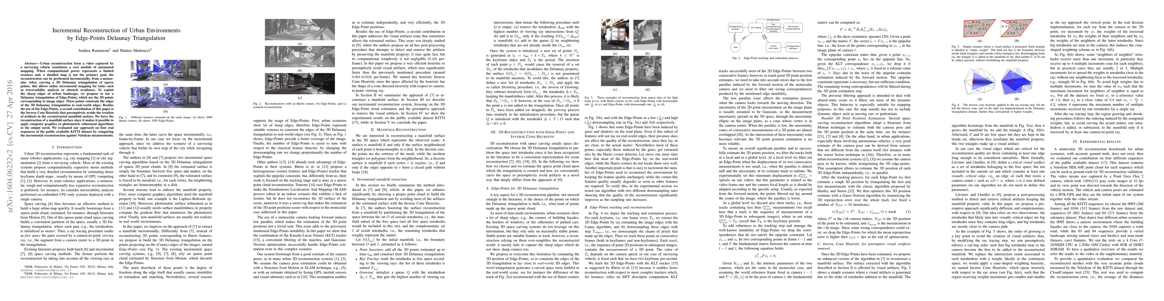 This paper proposes an incremental urban reconstruction method using Edge-Points Delaunay triangulation from monocular video, leveraging image edges to constrain the 3D triangulation and avoid artifacts with an Inverse Cone Heuristic. The approach was evaluated against Velodyne measurements on the KITTI dataset.