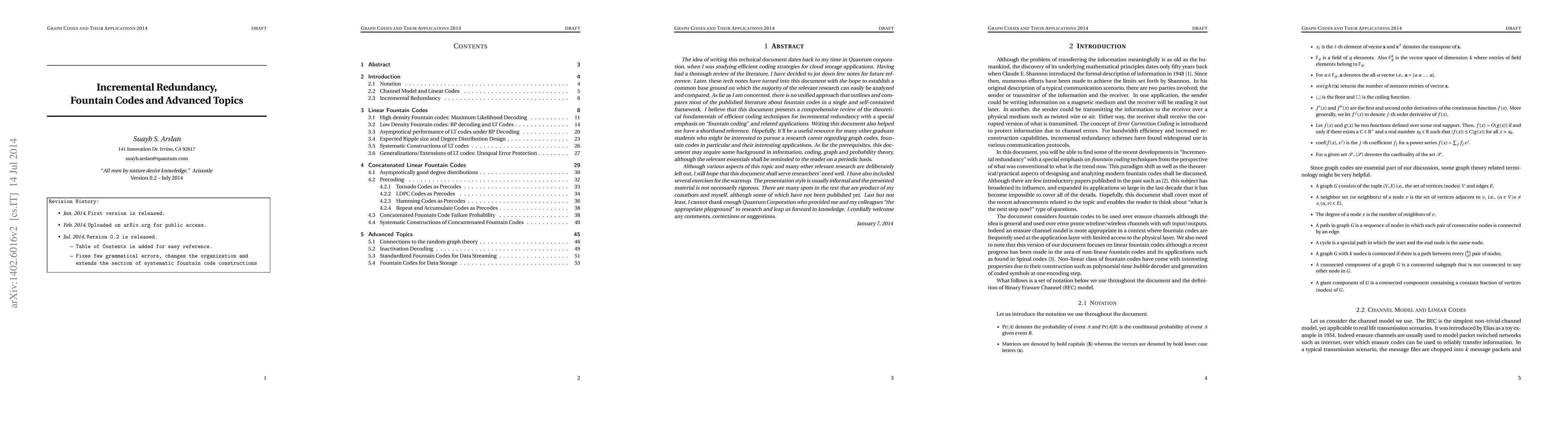 This document is written in order to establish a common base ground on which the majority of the relevant research about linear fountain codes can be analyzed and compared. As far as I am concerned, there is no unified approach that outlines and compares most of the published linear fountain codes in a single and self-contained framework. This written document has not only resulted in the review of theoretical fundamentals of efficient coding techniques for incremental redundancy and linear fountain coding, but also helped me have a comprehensive reference document and hopefully for many other graduate students who would like to have some background to pursue a research career regarding fountain codes and their various applications. Some background in information, coding, graph and probability theory is expected. Although various aspects of this topic and many other relevant research are deliberately left out, I still hope that this document shall serve researchers' need well. I have also included several exercises to warm up. The presentation style is usually informal and the presented material is not necessarily rigorous. There are many spots in the text that are product of my coauthors and myself, although some of which have not been published yet.