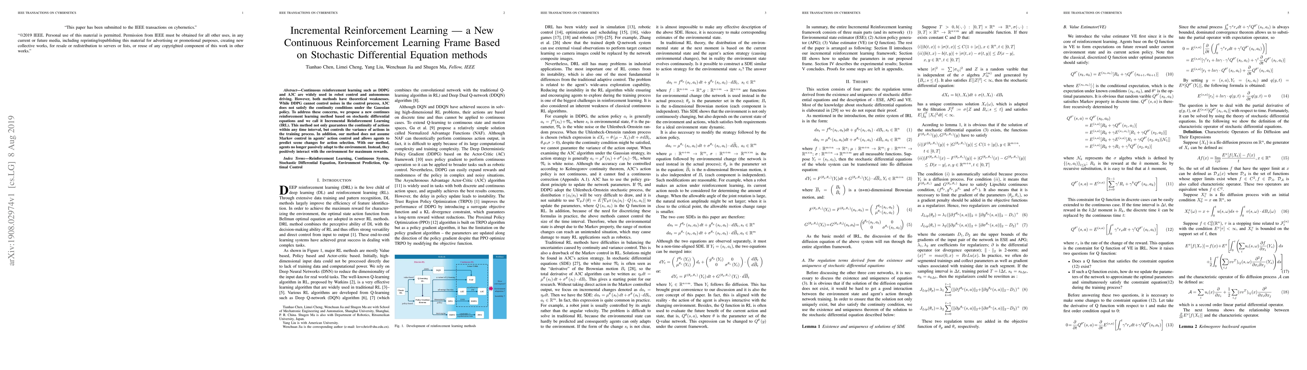 Summary: This paper introduces Incremental Reinforcement Learning (IRL), a novel continuous reinforcement learning framework based on stochastic differential equations, addressing the continuity and noise control issues in existing methods like DDPG and A3C. It enables agents to proactively interact with the environment for optimal rewards, without assuming Markov control.