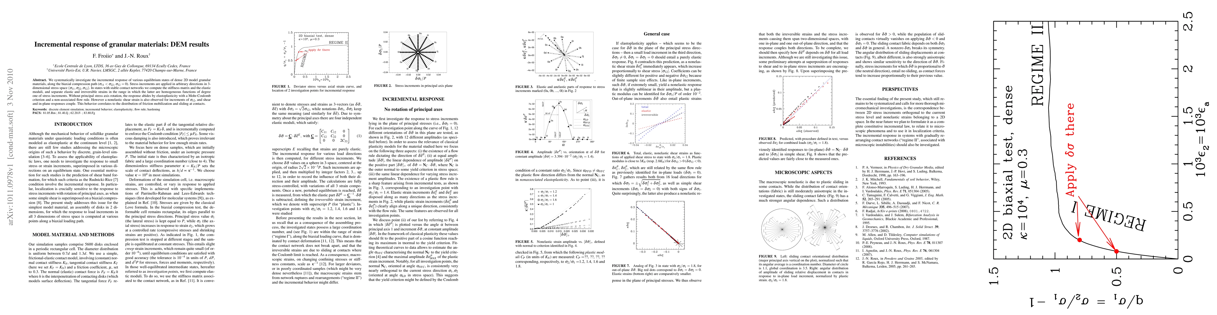 We systematically investigate the incremental response of various equilibrium states of dense 2D model granular materials, along the biaxial compression path (\sigma 11 < \sigma 22, \sigma 12 = 0). Stress increments are applied in arbitrary directions in 3- dimensional stress space (\sigma 11, \sigma 22, \sigma 12). In states with stable contact networks we compute the stiffness matrix and the elastic moduli, and separate elastic and irreversible strains in the range in which the latter are homogeneous functions of degree one of stress increments. Without principal stress axis rotation, the response abides by elastoplasticity with a Mohr-Coulomb criterion and a non-associated flow rule. However a nonelastic shear strain is also observed for increments of \sigma 12, and shear and in-plane responses couple. This behavior correlates to the distribution of friction mobilization and sliding at contacts.