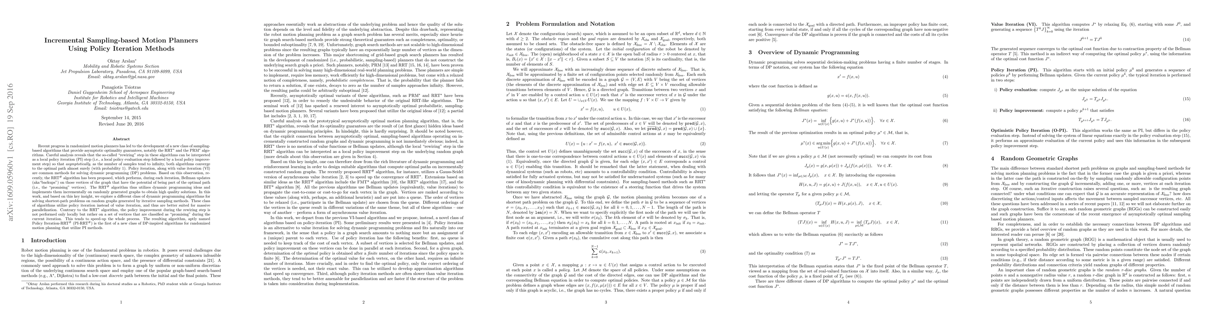 Recent progress in randomized motion planners has led to the development of a new class of sampling-based algorithms that provide asymptotic optimality guarantees, notably the RRT* and the PRM* algorithms. Careful analysis reveals that the so-called "rewiring" step in these algorithms can be interpreted as a local policy iteration (PI) step (i.e., a local policy evaluation step followed by a local policy improvement step) so that asymptotically, as the number of samples tend to infinity, both algorithms converge to the optimal path almost surely (with probability 1). Policy iteration, along with value iteration (VI) are common methods for solving dynamic programming (DP) problems. Based on this observation, recently, the RRT$^{\#}$ algorithm has been proposed, which performs, during each iteration, Bellman updates (aka "backups") on those vertices of the graph that have the potential of being part of the optimal path (i.e., the "promising" vertices). The RRT$^{\#}$ algorithm thus utilizes dynamic programming ideas and implements them incrementally on randomly generated graphs to obtain high quality solutions. In this work, and based on this key insight, we explore a different class of dynamic programming algorithms for solving shortest-path problems on random graphs generated by iterative sampling methods. These class of algorithms utilize policy iteration instead of value iteration, and thus are better suited for massive parallelization. Contrary to the RRT* algorithm, the policy improvement during the rewiring step is not performed only locally but rather on a set of vertices that are classified as "promising" during the current iteration. This tends to speed-up the whole process. The resulting algorithm, aptly named Policy Iteration-RRT$^{\#}$ (PI-RRT$^{\#}$) is the first of a new class of DP-inspired algorithms for randomized motion planning that utilize PI methods.