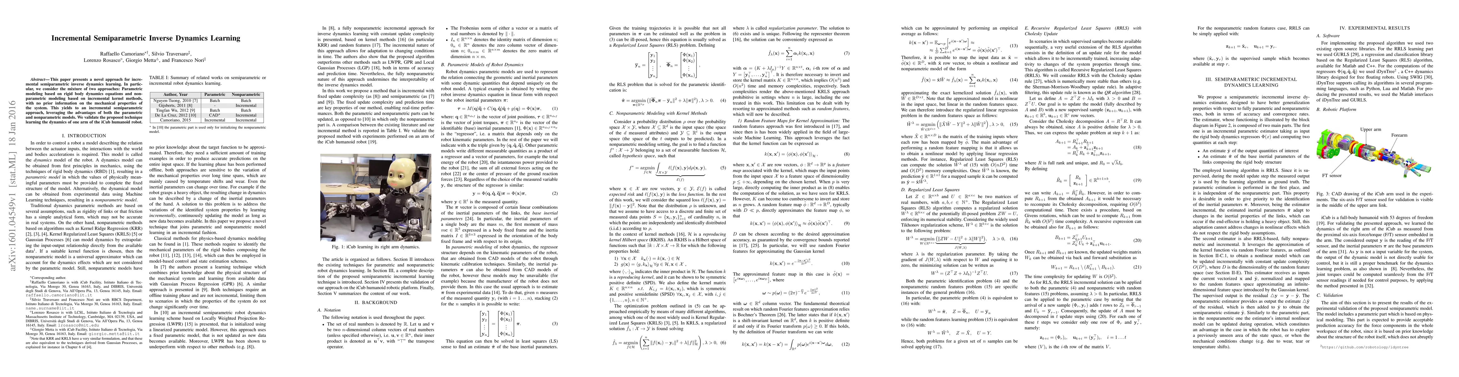This paper introduces an incremental semiparametric inverse dynamics learning method combining parametric and nonparametric models, validated on the iCub humanoid robot's arm dynamics. The approach leverages rigid body dynamics and incremental kernel methods without prior mechanical knowledge.