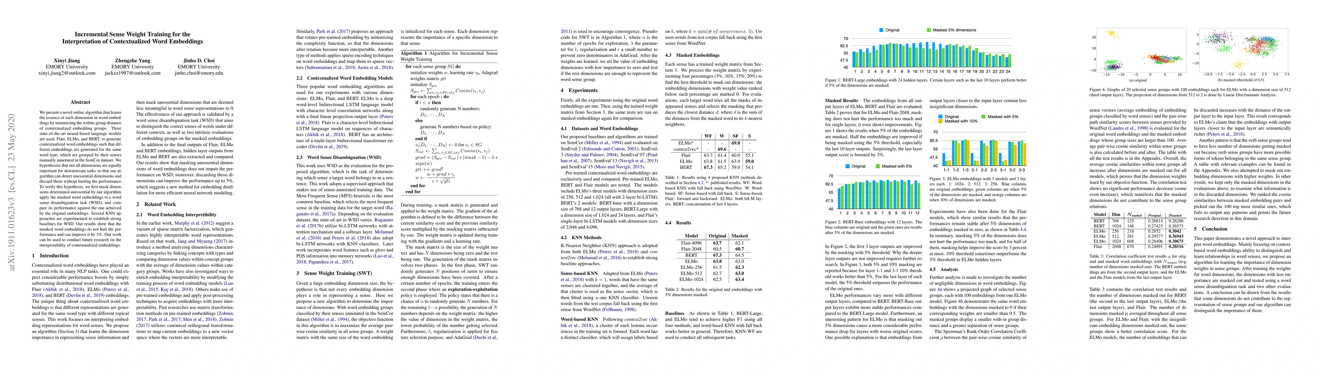 We present a novel online algorithm that learns the essence of each dimension in word embeddings by minimizing the within-group distance of contextualized embedding groups. Three state-of-the-art neural-based language models are used, Flair, ELMo, and BERT, to generate contextualized word embeddings such that different embeddings are generated for the same word type, which are grouped by their senses manually annotated in the SemCor dataset. We hypothesize that not all dimensions are equally important for downstream tasks so that our algorithm can detect unessential dimensions and discard them without hurting the performance. To verify this hypothesis, we first mask dimensions determined unessential by our algorithm, apply the masked word embeddings to a word sense disambiguation task (WSD), and compare its performance against the one achieved by the original embeddings. Several KNN approaches are experimented to establish strong baselines for WSD. Our results show that the masked word embeddings do not hurt the performance and can improve it by 3%. Our work can be used to conduct future research on the interpretability of contextualized embeddings.