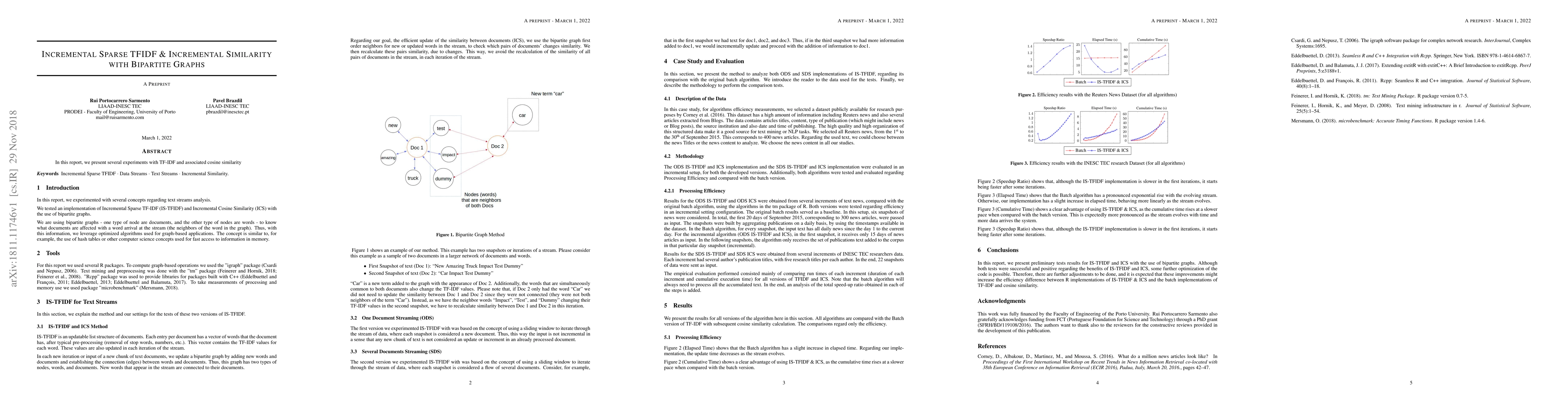 In this report, we experimented with several concepts regarding text streams analysis. We tested an implementation of Incremental Sparse TF-IDF (IS-TFIDF) and Incremental Cosine Similarity (ICS) with the use of bipartite graphs. We are using bipartite graphs - one type of node are documents, and the other type of nodes are words - to know what documents are affected with a word arrival at the stream (the neighbors of the word in the graph). Thus, with this information, we leverage optimized algorithms used for graph-based applications. The concept is similar to, for example, the use of hash tables or other computer science concepts used for fast access to information in memory.