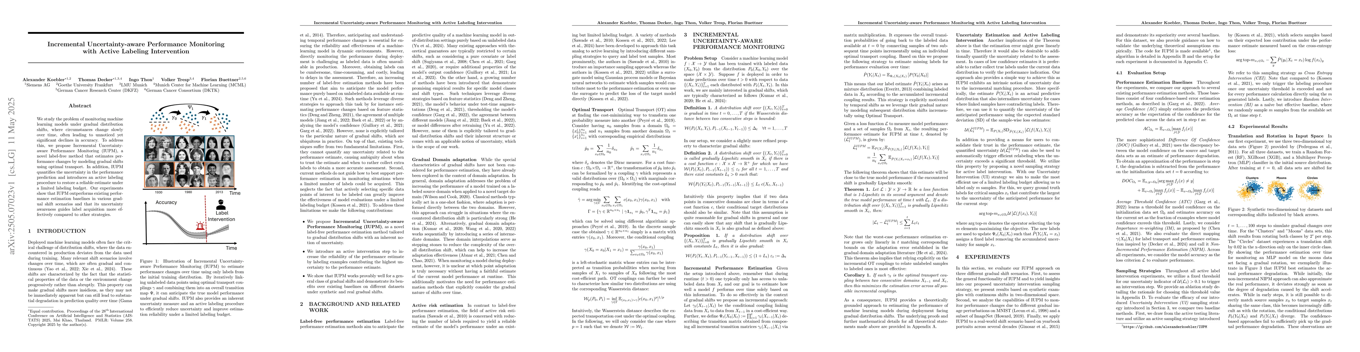 This research proposes a novel label-free method to monitor machine learning models under gradual distribution shifts, offering uncertainty-aware performance estimation with an active labeling intervention.