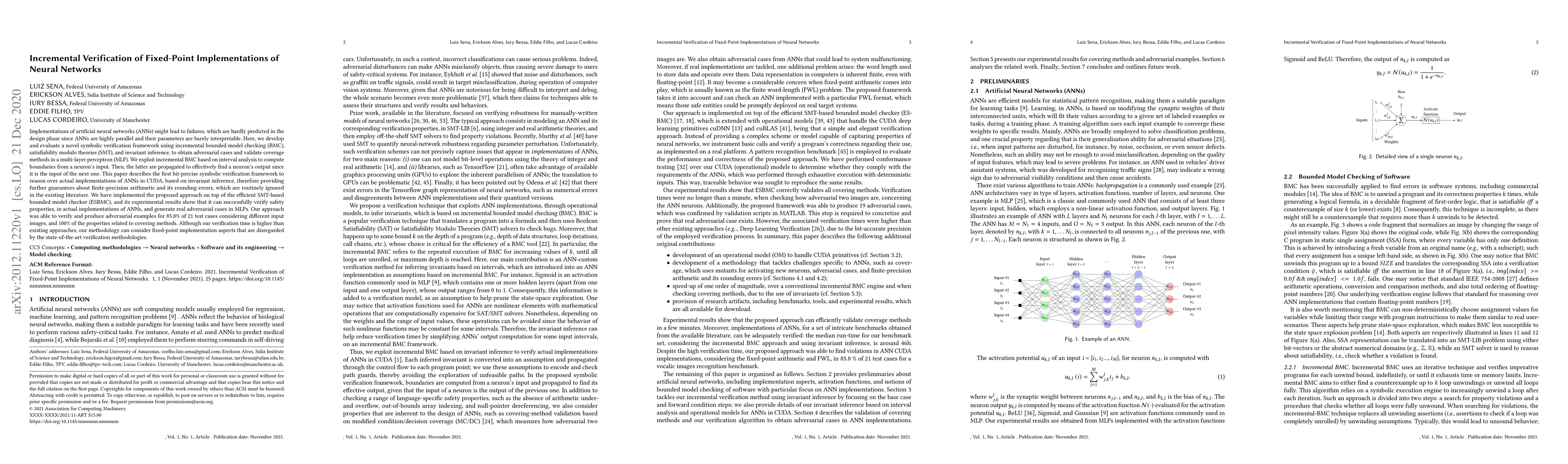 Implementations of artificial neural networks (ANNs) might lead to failures, which are hardly predicted in the design phase since ANNs are highly parallel and their parameters are barely interpretable. Here, we develop and evaluate a novel symbolic verification framework using incremental bounded model checking (BMC), satisfiability modulo theories (SMT), and invariant inference, to obtain adversarial cases and validate coverage methods in a multi-layer perceptron (MLP). We exploit incremental BMC based on interval analysis to compute boundaries from a neuron's input. Then, the latter are propagated to effectively find a neuron's output since it is the input of the next one. This paper describes the first bit-precise symbolic verification framework to reason over actual implementations of ANNs in CUDA, based on invariant inference, therefore providing further guarantees about finite-precision arithmetic and its rounding errors, which are routinely ignored in the existing literature. We have implemented the proposed approach on top of the efficient SMT-based bounded model checker (ESBMC), and its experimental results show that it can successfully verify safety properties, in actual implementations of ANNs, and generate real adversarial cases in MLPs. Our approach was able to verify and produce adversarial examples for 85.8% of 21 test cases considering different input images, and 100% of the properties related to covering methods. Although our verification time is higher than existing approaches, our methodology can consider fixed-point implementation aspects that are disregarded by the state-of-the-art verification methodologies.