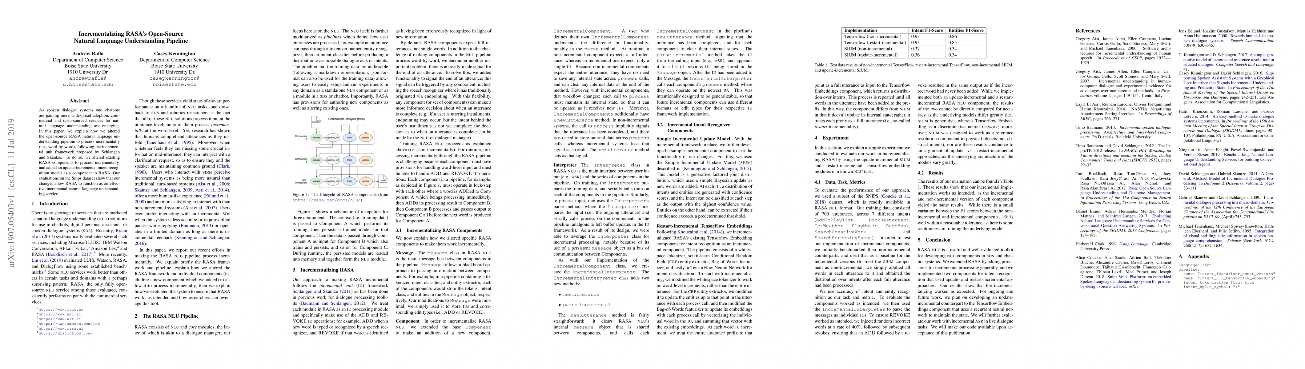 This paper details modifications to the RASA open-source natural language understanding pipeline to enable incremental processing, allowing it to handle inputs word-by-word. The changes include updating existing components and adding an incremental intent recognition model, which were evaluated on the Snips dataset, demonstrating improved performance.