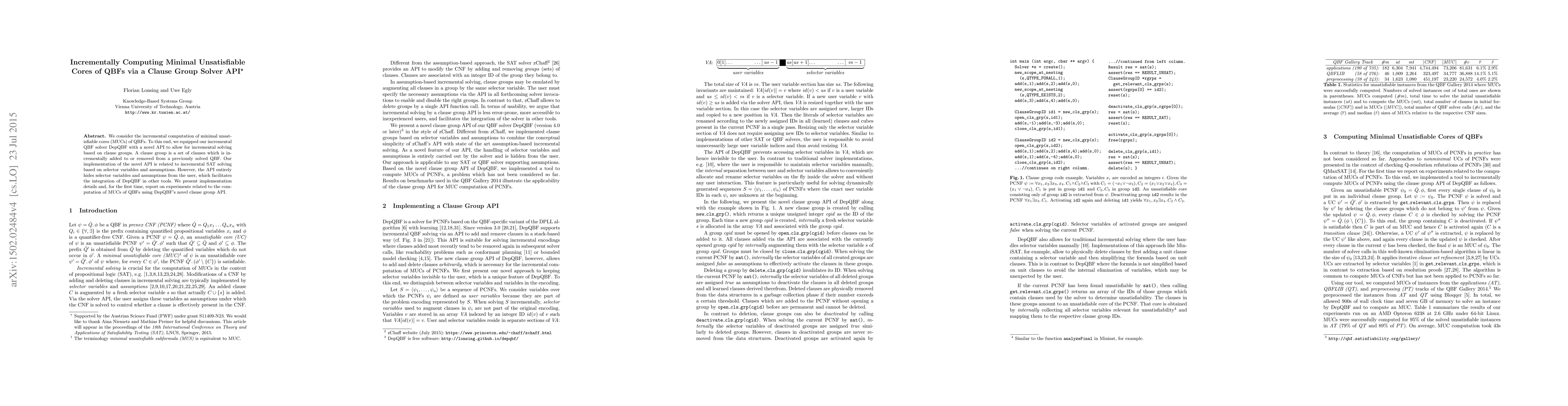 We consider the incremental computation of minimal unsatisfiable cores (MUCs) of QBFs. To this end, we equipped our incremental QBF solver DepQBF with a novel API to allow for incremental solving based on clause groups. A clause group is a set of clauses which is incrementally added to or removed from a previously solved QBF. Our implementation of the novel API is related to incremental SAT solving based on selector variables and assumptions. However, the API entirely hides selector variables and assumptions from the user, which facilitates the integration of DepQBF in other tools. We present implementation details and, for the first time, report on experiments related to the computation of MUCs of QBFs using DepQBF's novel clause group API.
