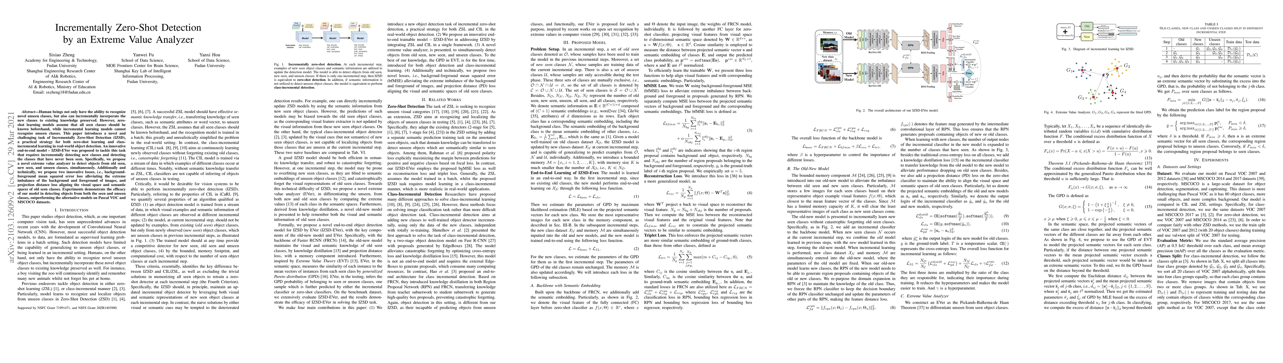 This paper introduces Incrementally Zero-Shot Detection (IZSD), a novel task combining zero-shot and class-incremental learning for object detection. It proposes an end-to-end model, IZSD-EVer, with an extreme value analyzer and two losses to handle old seen, new seen, and unseen classes, achieving superior performance on Pascal VOC and MSCOCO datasets.