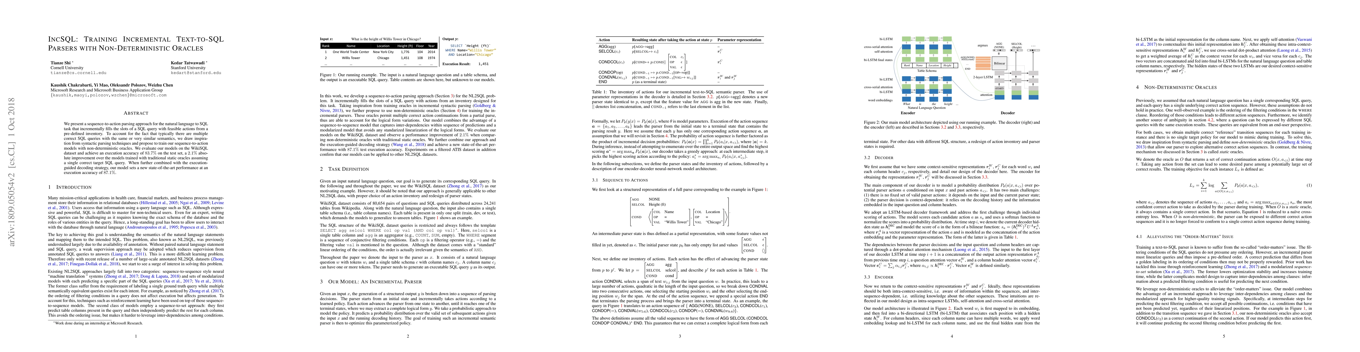 This paper proposes a sequence-to-action parser for natural language to SQL that achieves 87.1% execution accuracy with non-deterministic oracles, outperforming traditional static oracles.