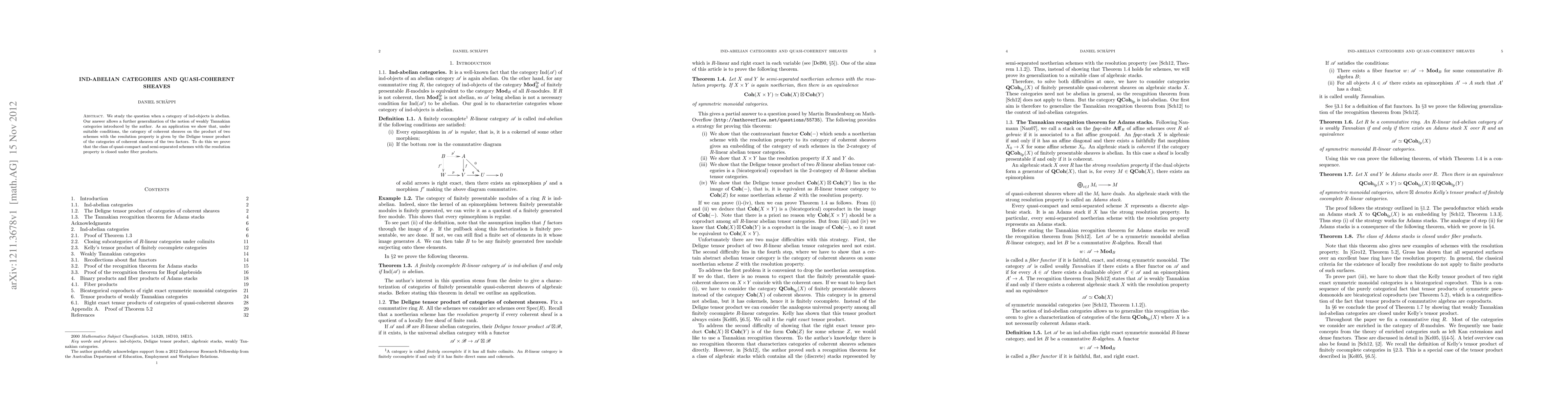 This paper investigates conditions under which a category of ind-objects is abelian, extending the concept of weakly Tannakian categories. It demonstrates that under specific conditions, the category of coherent sheaves on the product of two schemes with the resolution property corresponds to the Deligne tensor product of the categories of coherent sheaves of the individual schemes, proving that quasi-compact and semi-separated schemes with the resolution property are closed under fiber products.