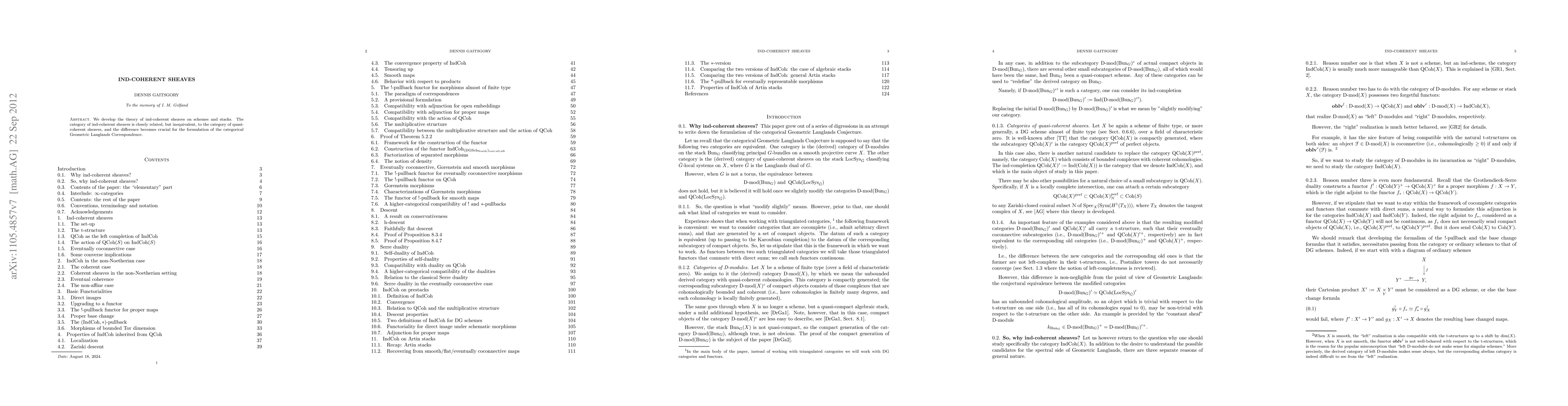 Summary: This paper develops the theory of ind-coherent sheaves on schemes and stacks, highlighting their distinct nature from quasi-coherent sheaves, which is pivotal for the categorical Geometric Langlands Correspondence.