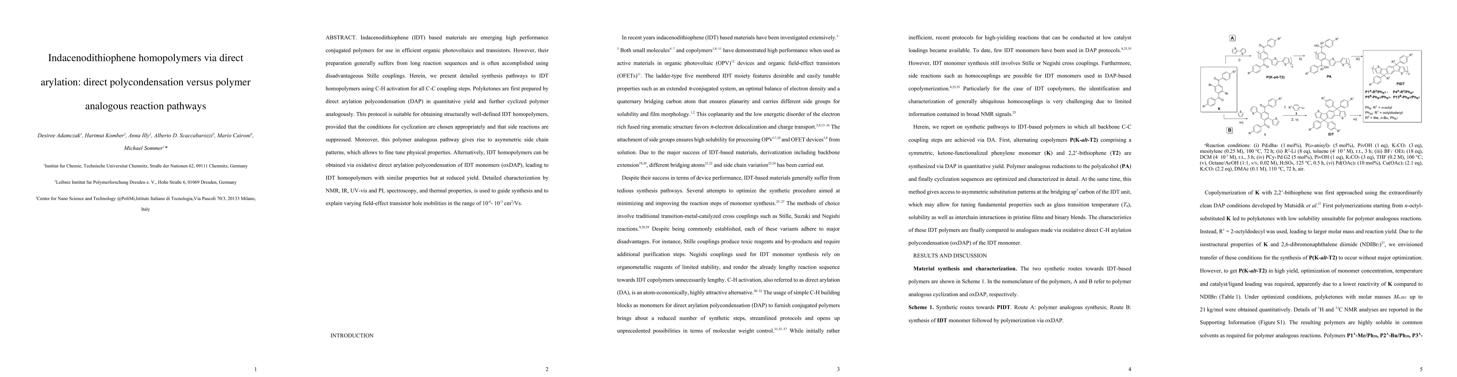 This paper presents two synthesis pathways for indacenodithiophene (IDT) homopolymers: direct arylation polycondensation (DAP) followed by polymer analogous cyclization, and oxidative direct arylation polycondensation (oxDAP). The DAP method yields well-defined IDT homopolymers with tunable side chain patterns, while the oxDAP method produces similar polymers but with lower yields. Detailed characterization confirms the structural and physical properties of the synthesized polymers.
