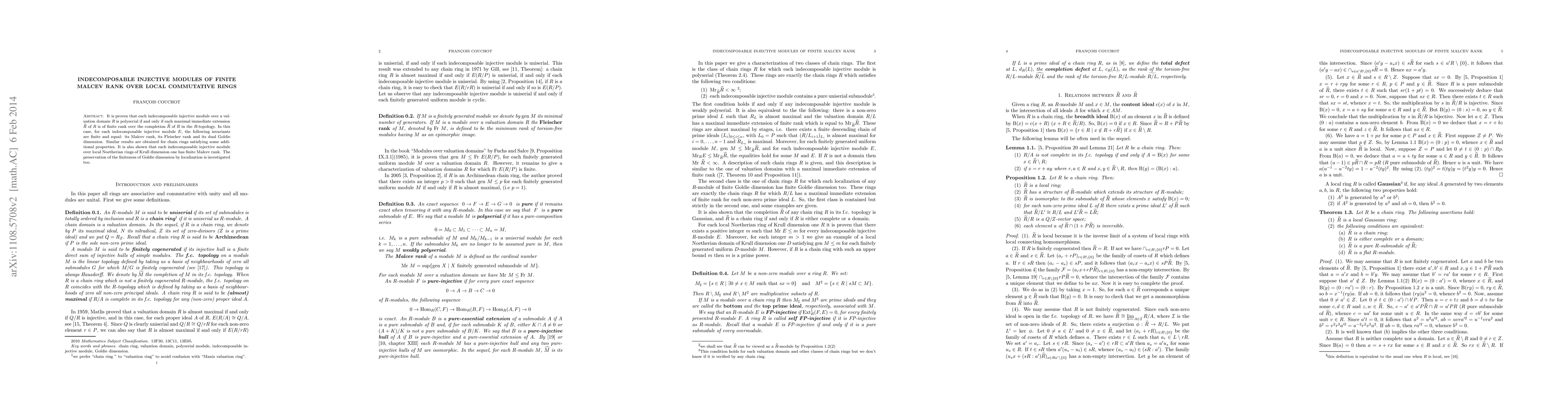 Summary: This paper proves that indecomposable injective modules over valuation domains are polyserial if their maximal immediate extensions have finite rank over completions. It also establishes that these modules have equal finite Malcev, Fleischer, and dual Goldie ranks and explores similar properties for chain rings and Krull-dimensional local Noetherian rings. The study further investigates the preservation of Goldie dimension finiteness by localization.