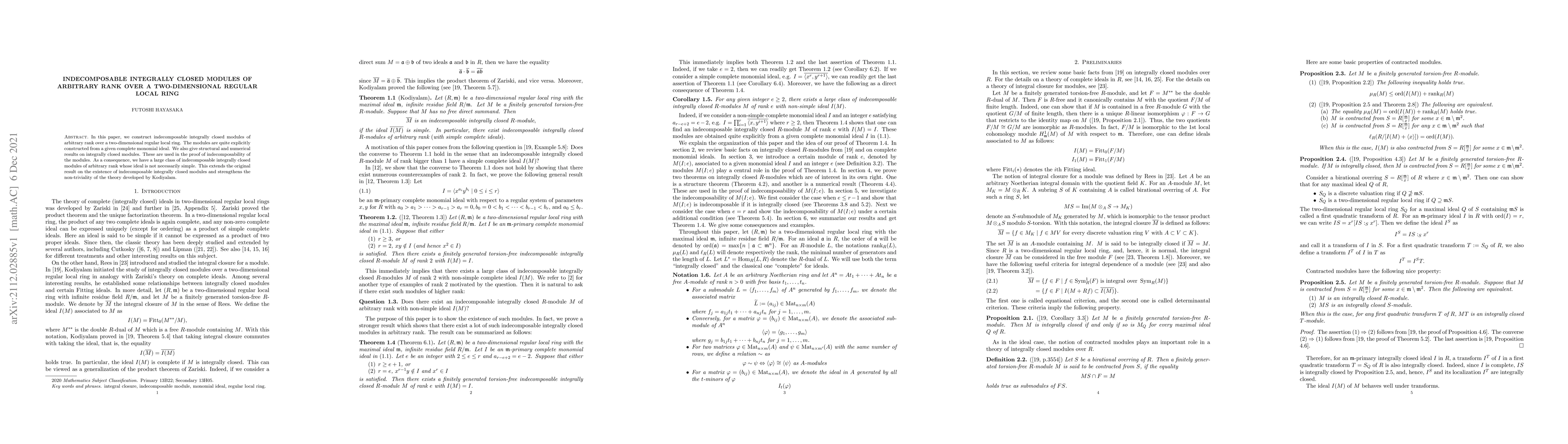 The paper constructs indecomposable integrally closed modules of arbitrary rank over a two-dimensional regular local ring using explicit matrices derived from complete monomial ideals.