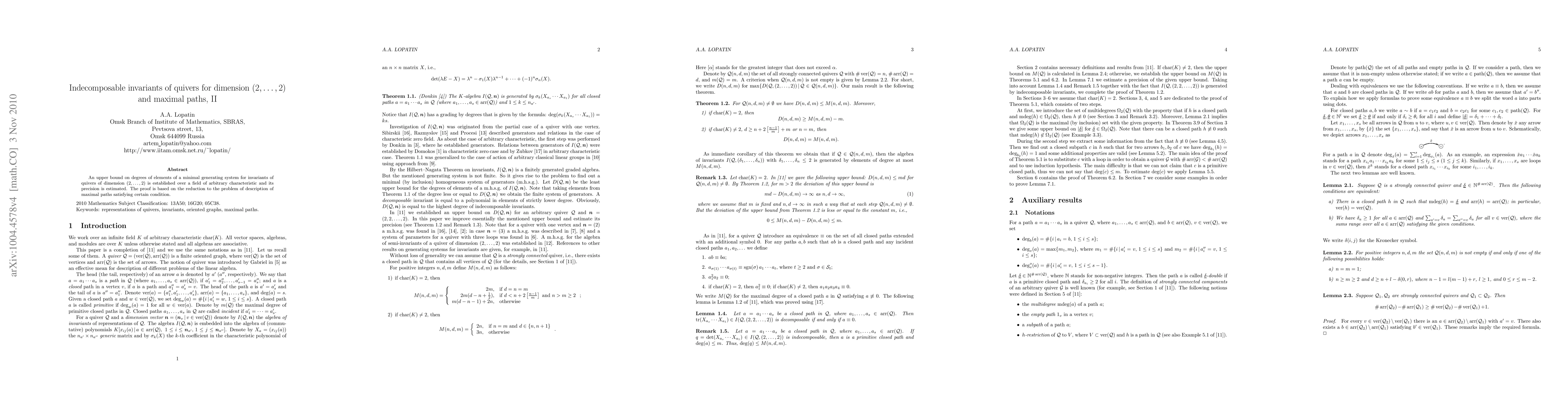 An upper bound on degrees of elements of a minimal generating system for invariants of quivers of dimension (2,...,2) is established over a field of arbitrary characteristic and its precision is estimated. The proof is based on the reduction to the problem of description of maximal paths satisfying certain condition.