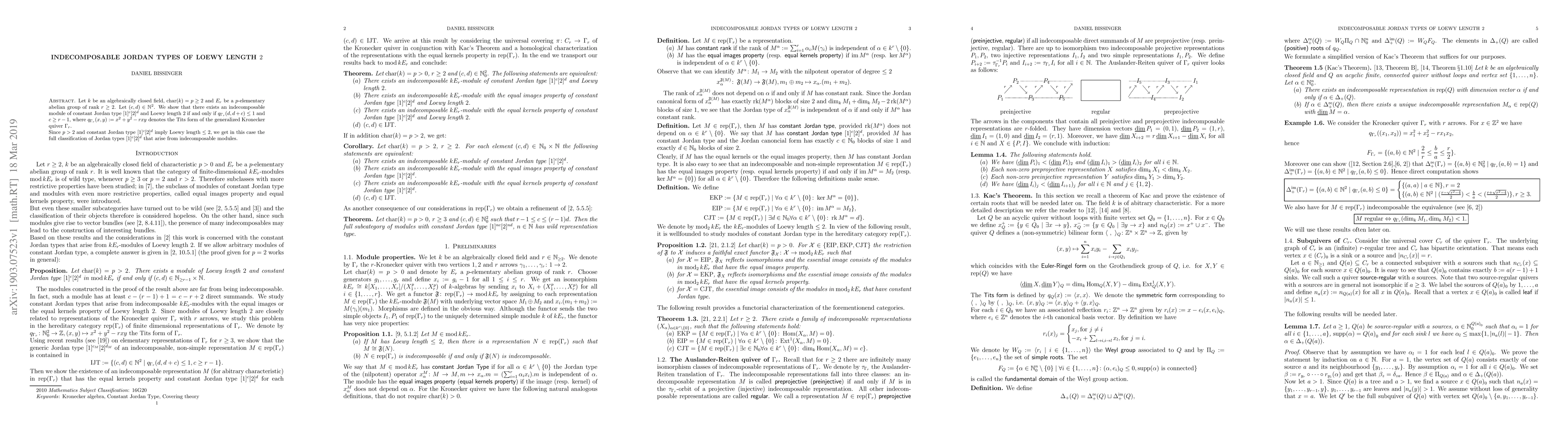 Let $k$ be an algebraically closed field, $\mathop{char}(k) = p \geq 2$ and $E_r$ be a $p$-elementary abelian group of rank $r \geq 2$. Let $(c,d) \in \mathbb{N}^2$. We show that there exists an indecomposable module of constant Jordan type $[1]^c [2]^d$ and Loewy length $2$ if and only if $q_{\Gamma_r}(d,d+c) \leq 1$ and $c \geq r-1$, where $q_{\Gamma_r}(x,y) := x^2 + y^2-rxy$ denotes the Tits form of the generalized Kronecker quiver $\Gamma_r$. Since $p > 2$ and constant Jordan type $[1]^c [2]^d$ imply Loewy length $\leq 2$, we get in this case the full classification of Jordan types $[1]^c [2]^d$ that arise from indecomposable modules.