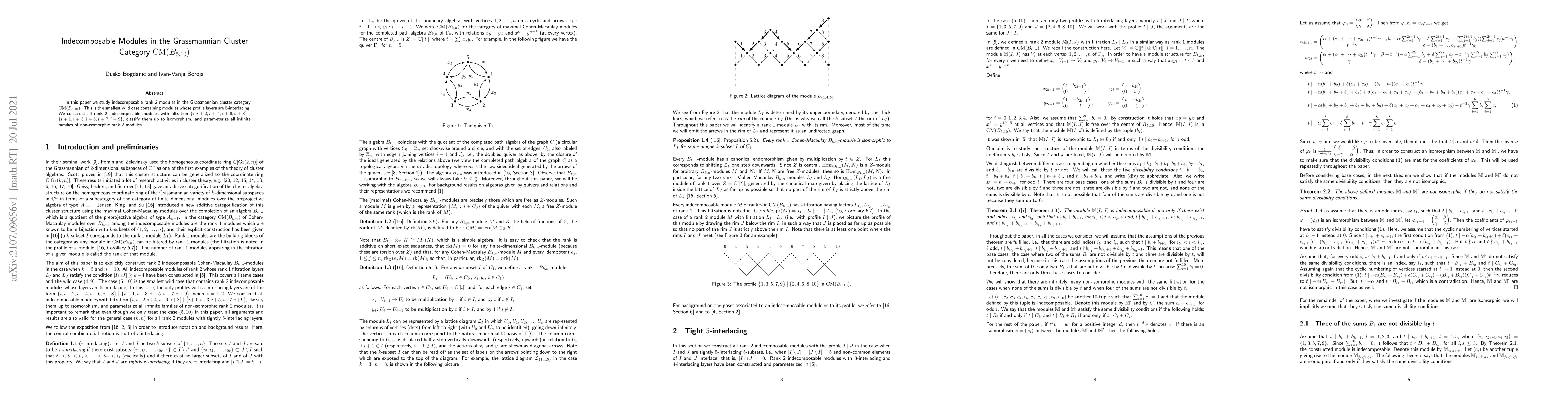 In this paper we study indecomposable rank 2 modules in the Grassmannian cluster category ${\rm CM}(B_{5,10})$. This is the smallest wild case containing modules whose profile layers are $5$-interlacing. We construct all rank 2 indecomposable modules with filtration $\{i,i+2,i+4,i+6,i+8\}\mid \{i+1,i+3,i+5,i+7,i+9\}$, classify them up to isomorphism, and parameterize all infinite families of non-isomorphic rank 2 modules.