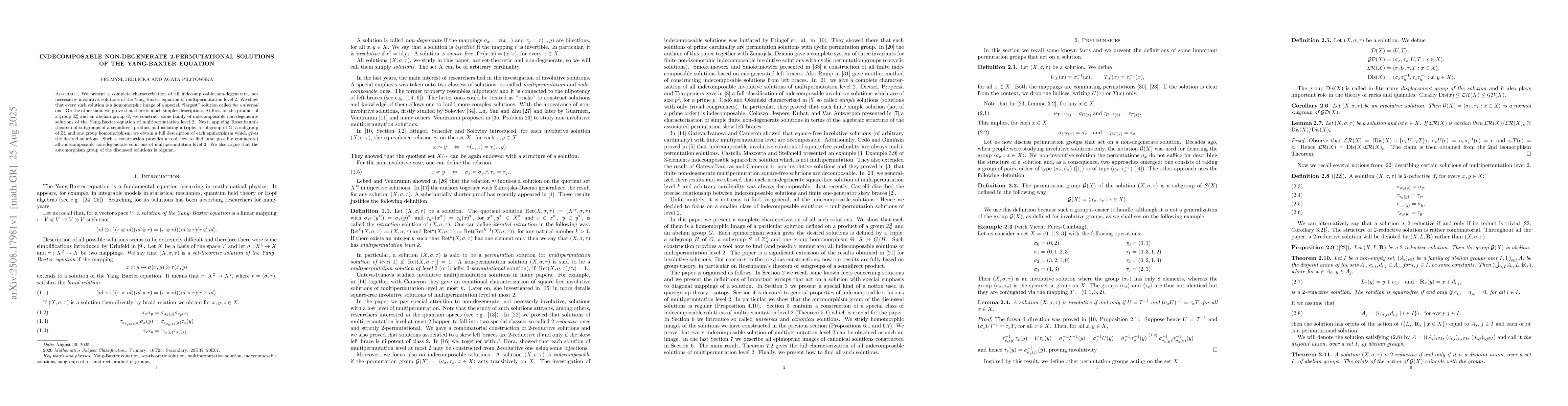 We present a complete characterization of all indecomposable non-degenerate, not necessarily involutive, solutions of the Yang-Baxter equation of multipermutation level~2. We show that every such solution is a homomorphic image of a special, ``largest'' solution called \emph{the universal} one. On the other hand we prove that there is much simpler description. At first, on the product of a group $Z_n^2$ and an abelian group $G$, we construct some family of indecomposable non-degenerate solutions of the Yang-Baxter equation of multipermutation level $2$. Next, applying Rosenbaum's theorem of subgroups of a semidirect product and isolating a triple: a subgroup of $G$, a subgroup of $Z_n^2$ and one group homomorphism, we obtain a~full description of each epimorphism which gives the desired solutions. Such a construction provides a tool how to find (and possibly enumerate) all indecomposable non-degenerate solutions of multipermutation level $2$. We also argue that the automorphism group of the discussed solutions is regular.