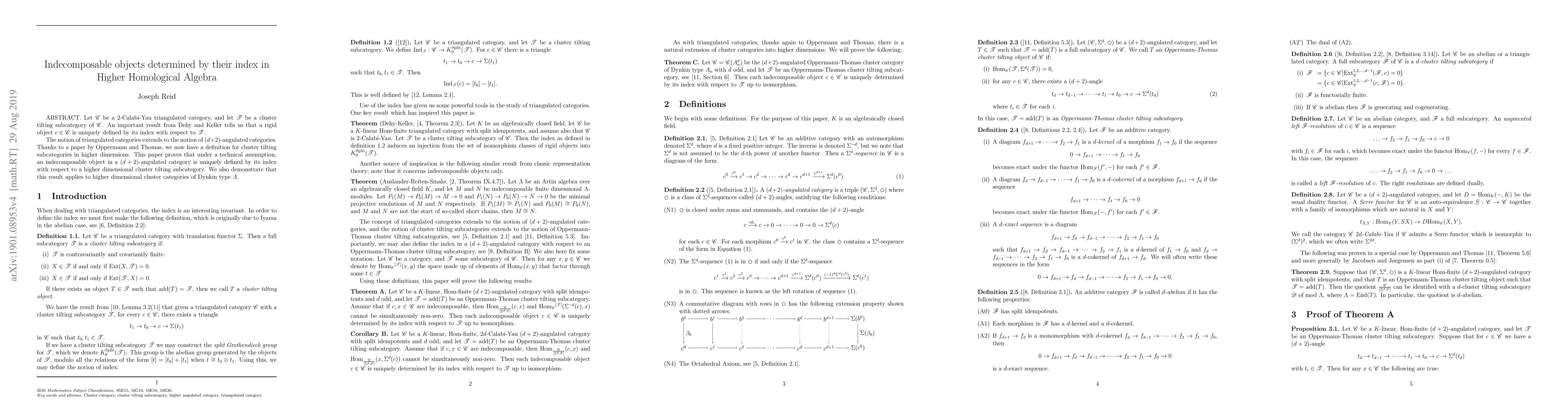 Let $\mathscr{C}$ be a 2-Calabi-Yau triangulated category, and let $\mathscr{T}$ be a cluster tilting subcategory of $\mathscr{C}$. An important result from Dehy and Keller tells us that a rigid object $c \in \mathscr{C}$ is uniquely defined by its index with respect to $\mathscr{T}$. The notion of triangulated categories extends to the notion of $(d+2)$-angulated categories. Thanks to a paper by Oppermann and Thomas, we now have a definition for cluster tilting subcategories in higher dimensions. This paper proves that under a technical assumption, an indecomposable object in a $(d+2)$-angulated category is uniquely defined by its index with respect to a higher dimensional cluster tilting subcategory. We also demonstrate an application of this result in higher dimensional cluster categories.