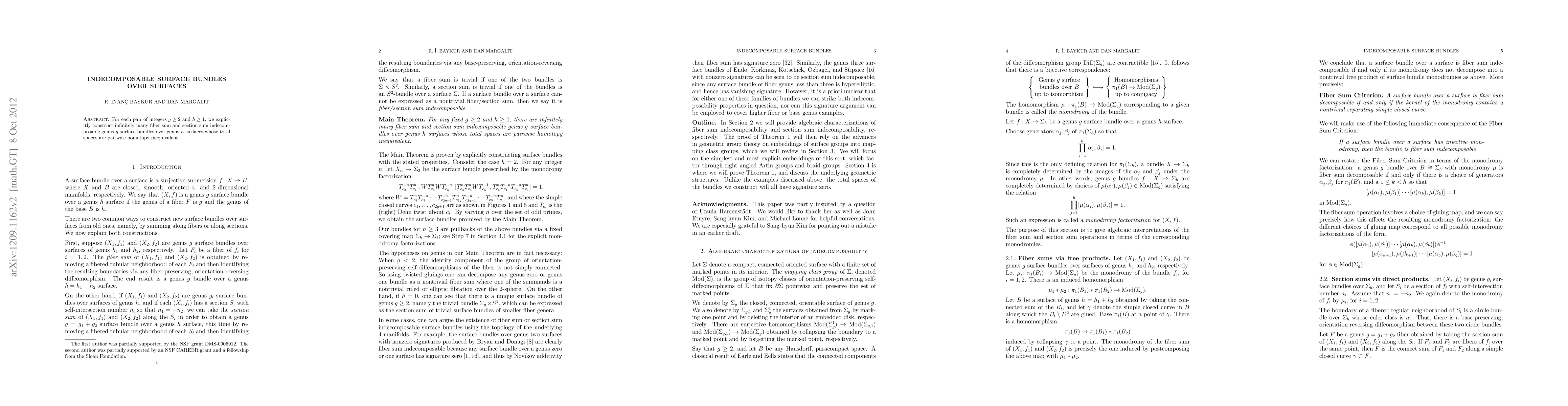Summary: The paper constructs infinitely many indecomposable genus g surface bundles over genus h surfaces, demonstrating that their total spaces are pairwise homotopy inequivalent through fiber sum and section sum methods. This provides a detailed construction for specific pairs of integers g and h.
