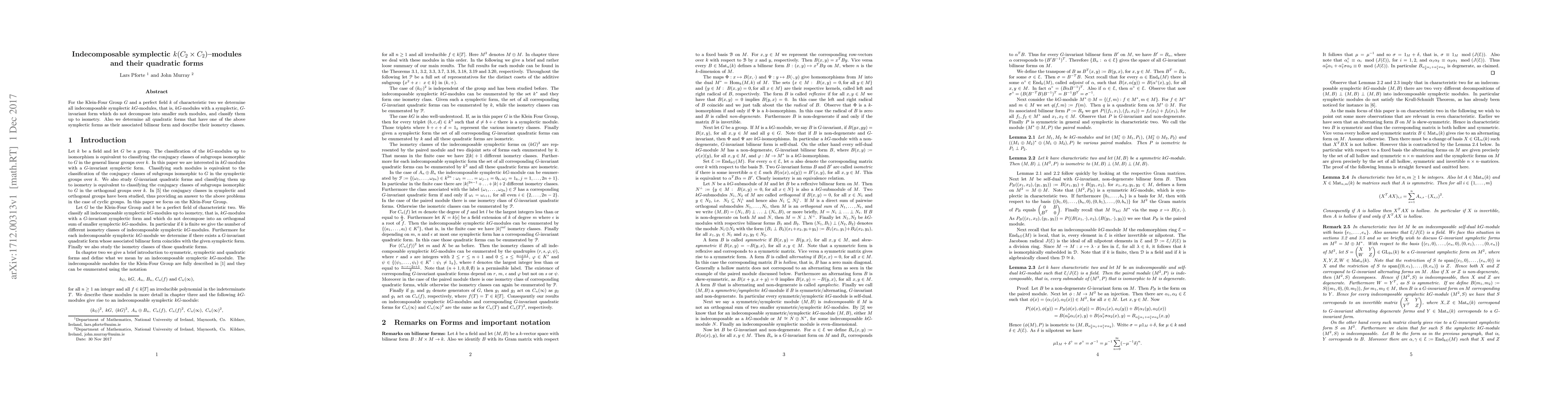 This research identifies and classifies indecomposable symplectic $kG$-modules for the Klein-Four Group $G$ over a perfect field $k$ of characteristic two, determining their structure and associated quadratic forms, and their isometry classes.