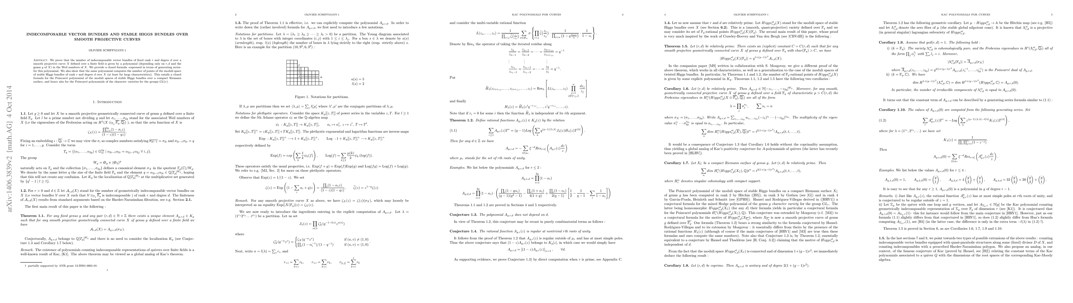 We prove that the number of indecomposable vector bundles of fixed rank r and degree d over a smooth projective curve X defined over a finite field is given by a polynomial (depending only on the pair (r,d) and the genus g of X) in the Weil numbers of X. We provide a closed formula -expressed in terms of generating series- for this polynomial. We also show that the same polynomial computes the number of points of the moduli space of stable Higgs bundles of rank r and degree d over X (at least for large characteristics). This entails a closed formula for the Poincar\'e polynomial of the moduli spaces of stable Higgs bundles over a compact Riemann surface, and hence also for the Poincar\'e polynomials of the character varieties for the groups GL(r).