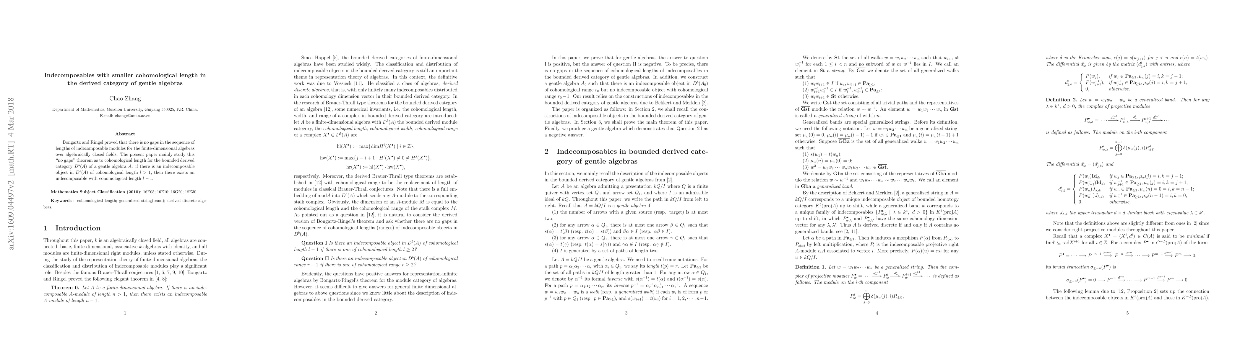 Bongartz and Ringel proved that there is no gaps in the sequence of lengths of indecomposable modules for the finite-dimensional algebras over algebraically closed fields. The present paper mainly study this "no gaps" theorem for the bounded derived module category $D^b(A)$ of a gentle algebra $A$: if there is an indecomposable object in $D^b(A)$ of cohomological length $l>1$, then there exists an indecomposable with cohomological length $l-1$.