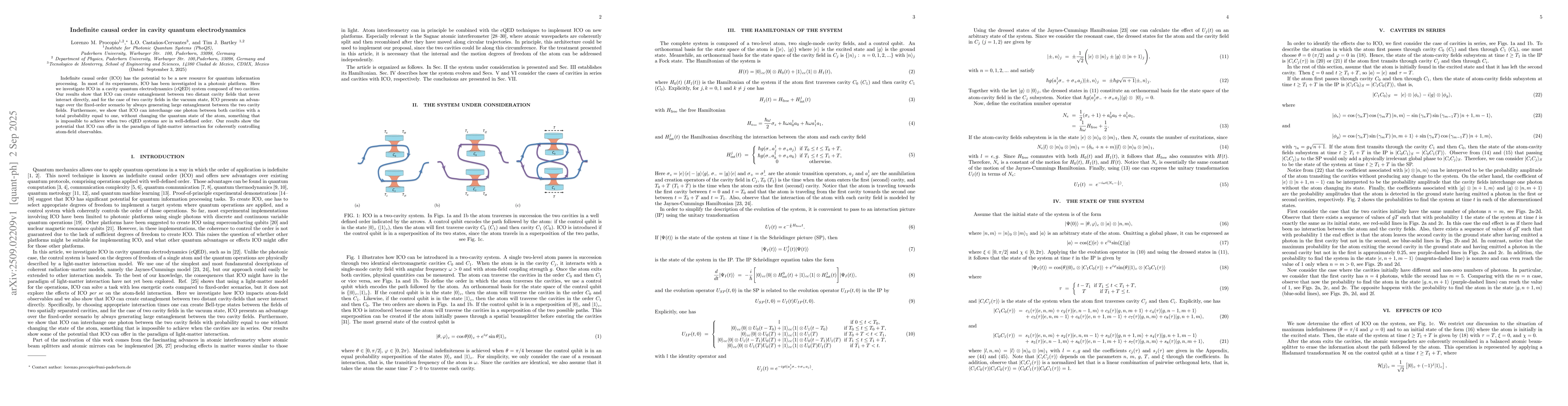 Indefinite causal order (ICO) has the potential to be a new resource for quantum information processing. In most of its experiments, ICO has been investigated in a photonic platform. Here we investigate ICO in a cavity quantum electrodynamics (cQED) system composed of two cavities. Our results show that ICO can create entanglement between two distant cavity fields that never interact directly, and for the case of two cavity fields in the vacuum state, ICO presents an advantage over the fixed-order scenario by always generating large entanglement between the two cavity fields. Furthermore, we show that ICO can interchange one photon between both cavities with a total probability equal to one, without changing the quantum state of the atom, something that is impossible to achieve when two cQED systems are in well-defined order. Our results show the potential that ICO can offer in the paradigm of light-matter interaction for coherently controlling atom-field observables.