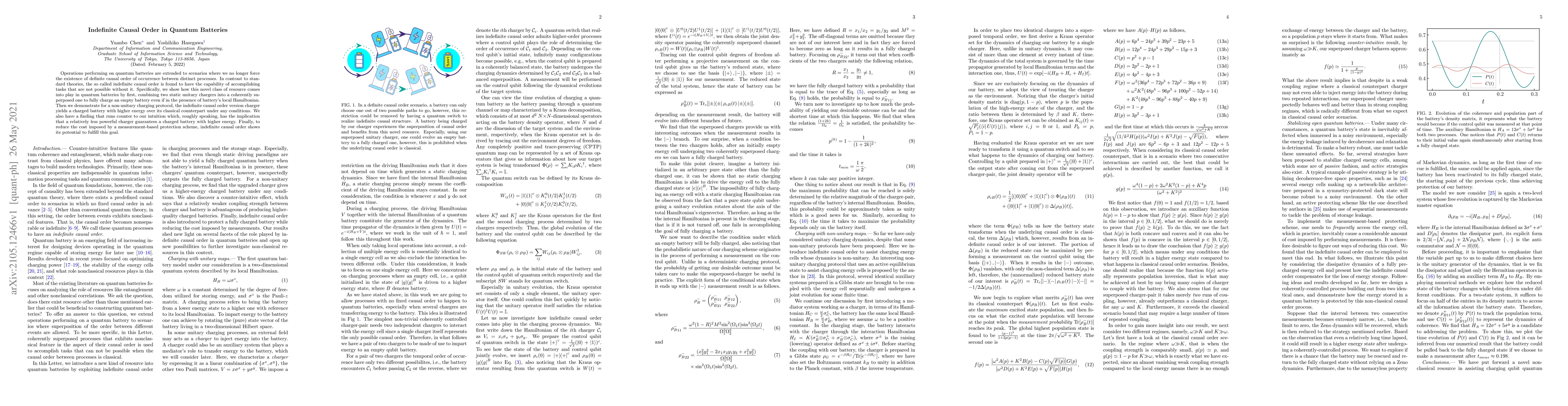 Operations performing on quantum batteries are extended to scenarios where we no longer force the existence of definite causal order of occurrence between distinct processes. In contrast to standard theories, the so called indefinite causal order is found to have the capability of accomplishing tasks that are not possible without it. Specifically, we show how this novel class of resource comes into play in quantum batteries by first, combining two static unitary chargers into a coherently superposed one to fully charge an empty battery even if in the presence of battery's local Hamiltonian. Then we demonstrate for a non-unitary charging protocol, the indefinite causal order version charger yields a charged battery with higher energy over its classical counterpart under any conditions. We also have a finding that runs counter to our intuition which, roughly speaking, has the implication that a relatively less powerful charger guarantees a charged battery with higher energy. Finally, to reduce the cost imposed by a measurement-based protection scheme, indefinite causal order shows its potential to fulfill this goal.