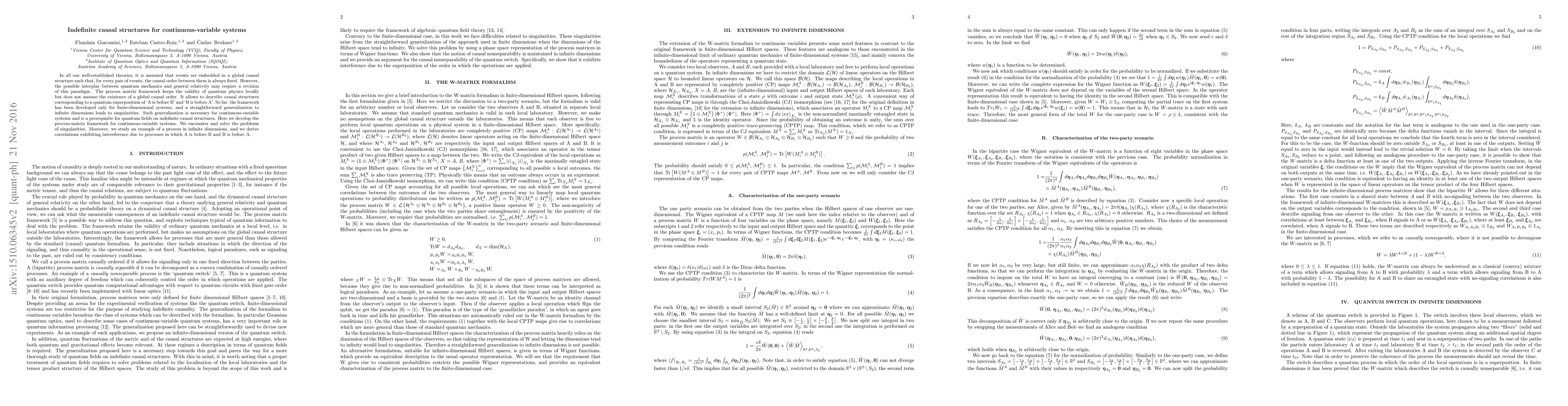 This paper extends the process-matrix framework to continuous-variable systems, allowing for indefinite causal structures where the causal order between events is not globally fixed. The authors address singularities that arise in this generalization and demonstrate interference correlations in infinite dimensions.