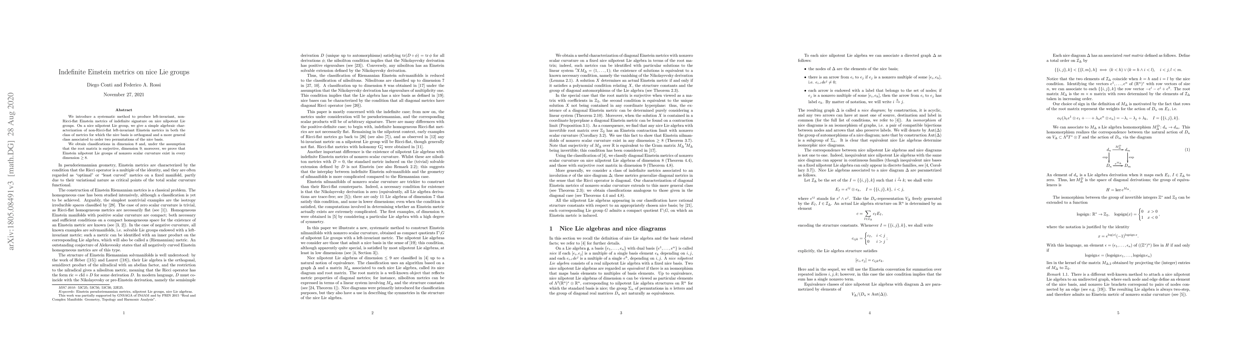 This paper presents a method for generating left-invariant, non-Ricci-flat Einstein metrics of indefinite signature on nice nilpotent Lie groups, providing algebraic characterizations for these metrics. It classifies such metrics in dimensions 8 and 9, and proves the existence of Einstein nilpotent Lie groups with nonzero scalar curvature in dimensions $\geq 8$.