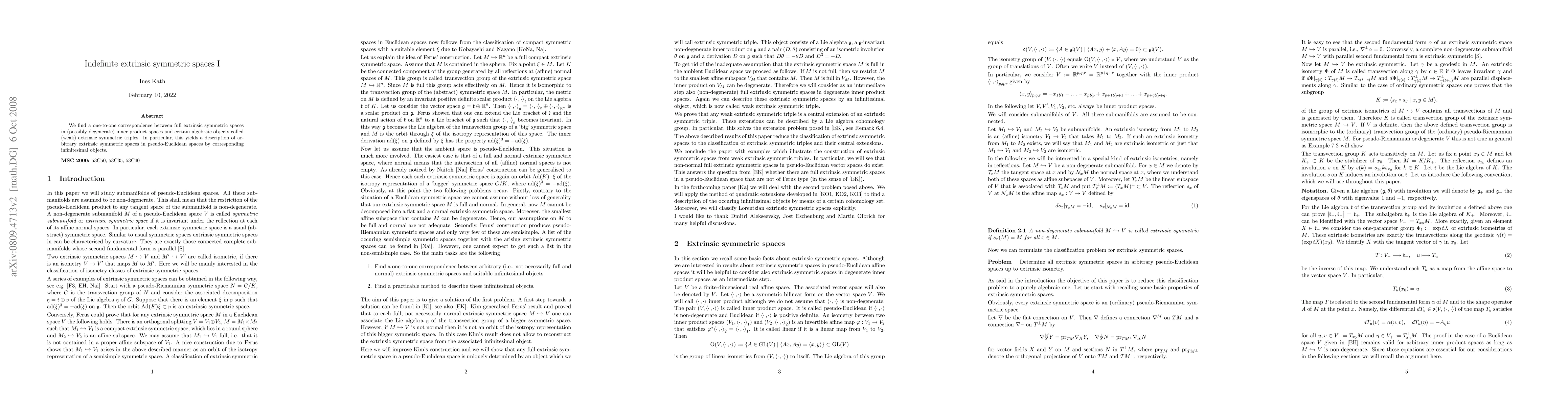We find a one-to-one correspondence between full extrinsic symmetric spaces in (possibly degenerate) inner product spaces and certain algebraic objects called (weak) extrinsic symmetric triples. In particular, this yields a description of arbitrary extrinsic symmetric spaces in pseudo-Euclidean spaces by corresponding infinitesimal objects.