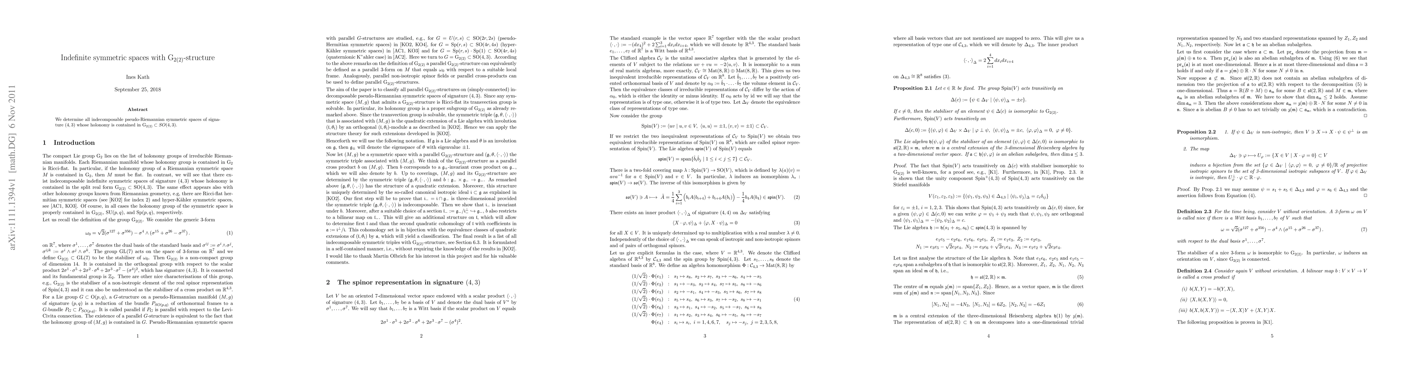 We determine all indecomposable pseudo-Riemannian symmetric spaces of signature (4,3) whose holonomy is contained in $G_{2(2)}\subset SO(4,3)$.