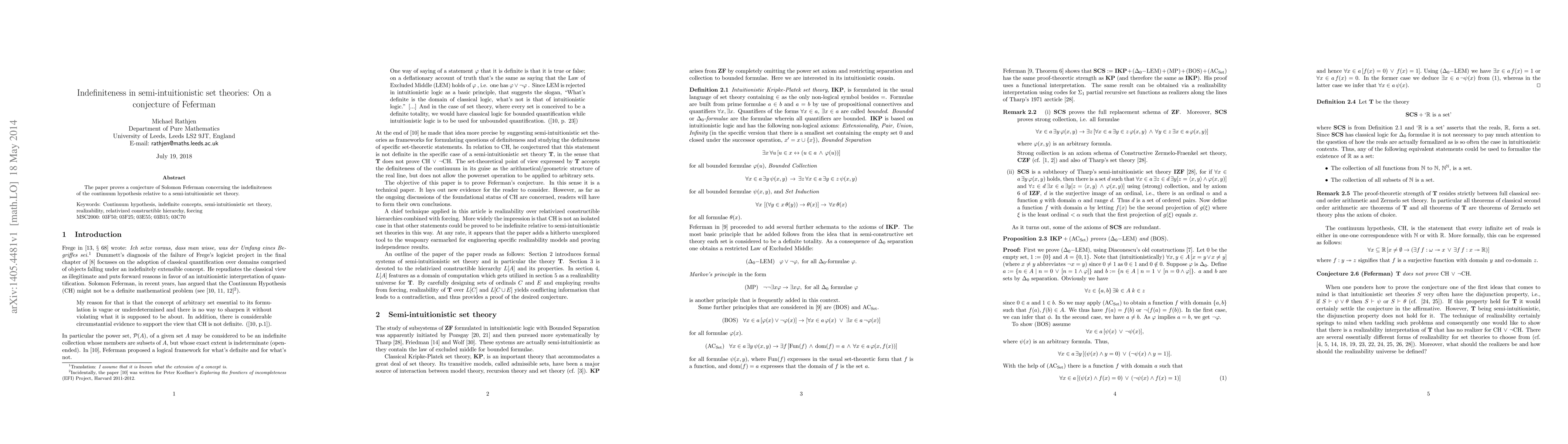 The paper proves a conjecture of Solomon Feferman concerning the indefiniteness of the continuum hypothesis relative to a semi-intuitionistic set theory.