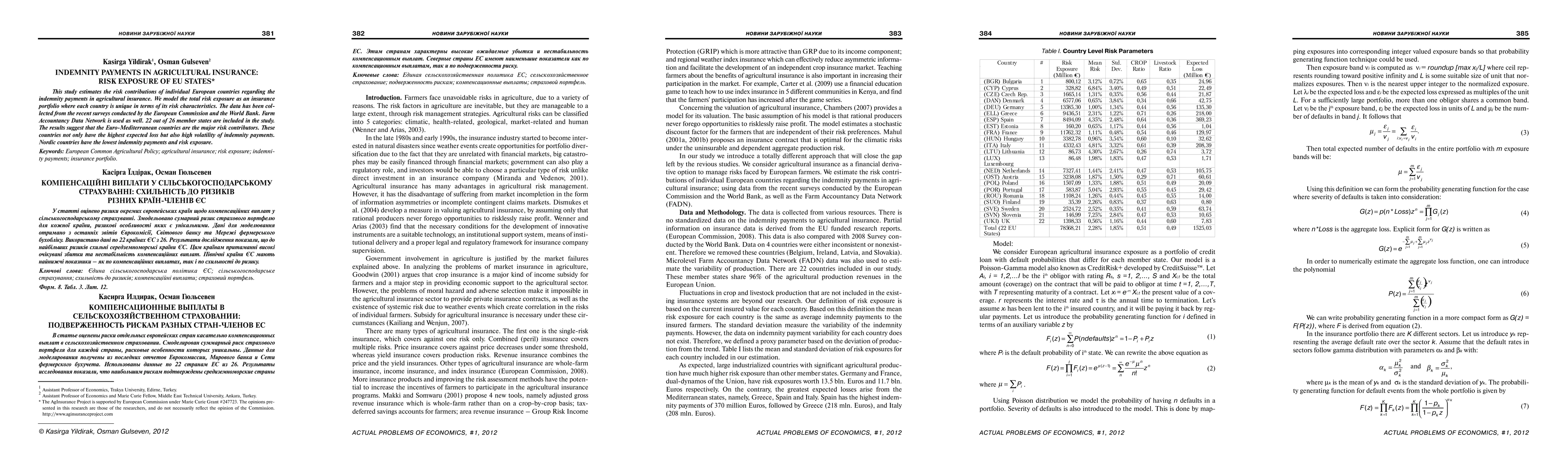 This study estimates the risk contributions of individual European countries regarding the indemnity payments in agricultural insurance. We model the total risk exposure as an insurance portfolio where each country is unique in terms of its risk characteristics. The data has been collected from the recent surveys conducted by the European Commission and the World Bank. Farm Accountancy Data Network is used as well. 22 out of 26 member states are included in the study. The results suggest that the EuroMediterranean countries are the major risk contributors. These countries not only have the highest expected loss but also high volatility of indemnity payments. Nordic countries have the lowest indemnity payments and risk exposure.