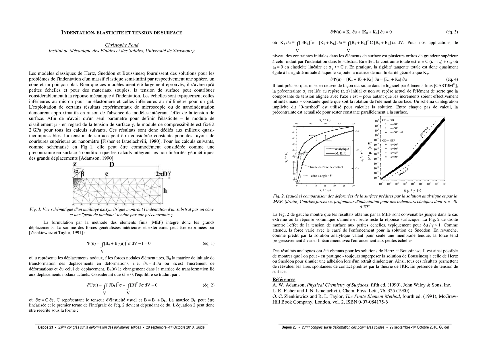 The classical models of Hertz, Sneddon and Boussinesq provide solutions for problems of indentation of a semi-infinite elastic massif by a sphere, a sphere or a cone and a flat punch. Although these models have been widely tested, it appears that at small scales and for flexible materials, surface tension can contribute to considerably to the mechanical response to indentation. The scales are typically those of the less than one micron for an elastomer and less than one millimetre for a gel. The exploitation of certain experimental results of microscopy or nanoindentation remain approximate due to the absence of models incorporating the effect of surface tension.