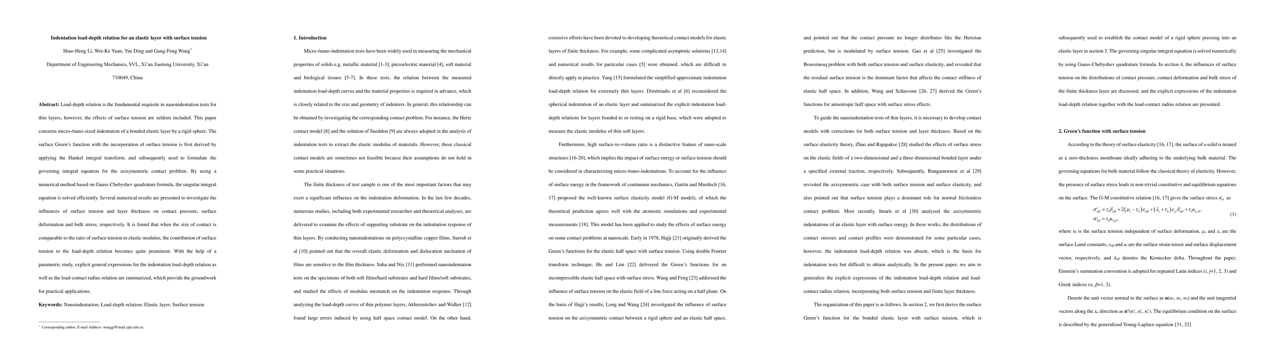 This paper derives the load-depth relation for nanoindentation of elastic layers, incorporating surface tension effects through the surface Green function. Numerical results highlight that surface tension significantly influences the indentation process when contact size is comparable to the ratio of surface tension to elastic modulus, leading to general expressions for load-depth and load-contact radius relations.
