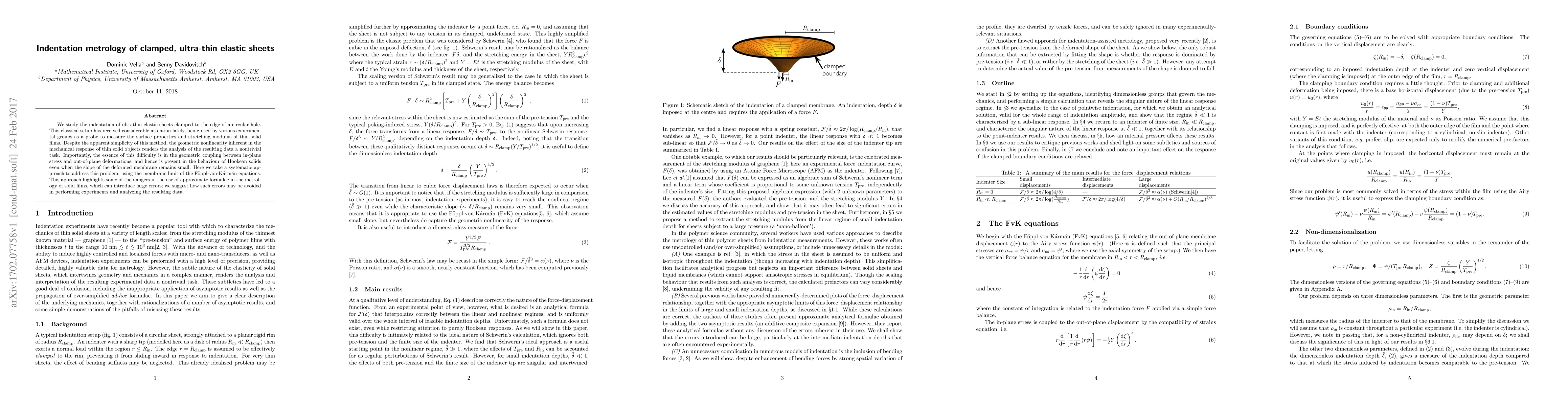 This paper investigates the indentation of clamped ultrathin elastic sheets, addressing the geometric nonlinearity in their mechanical response. It proposes a systematic approach using the membrane limit of the Föppl-von Kármán equations to analyze the coupling between in-plane stress and out-of-plane deformations, highlighting potential errors in approximate formulae and suggesting improvements for accurate metrology of thin solid films.