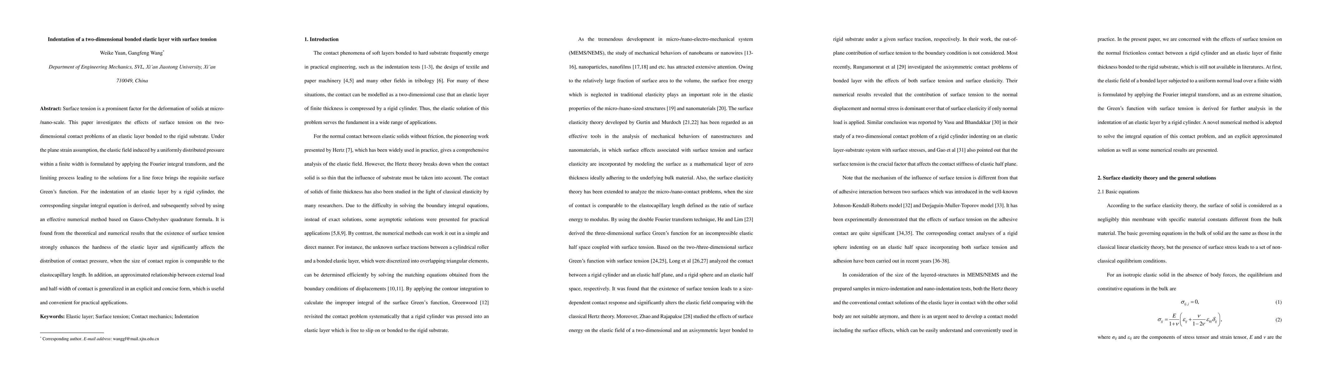 This paper examines how surface tension affects the deformation of a two-dimensional elastic layer bonded to a rigid substrate under indentation by a rigid cylinder. It finds that surface tension enhances the hardness and alters the contact pressure distribution when the contact region's size is near the elastocapillary length, and provides a simplified formula relating external load to the contact region's width for practical use.