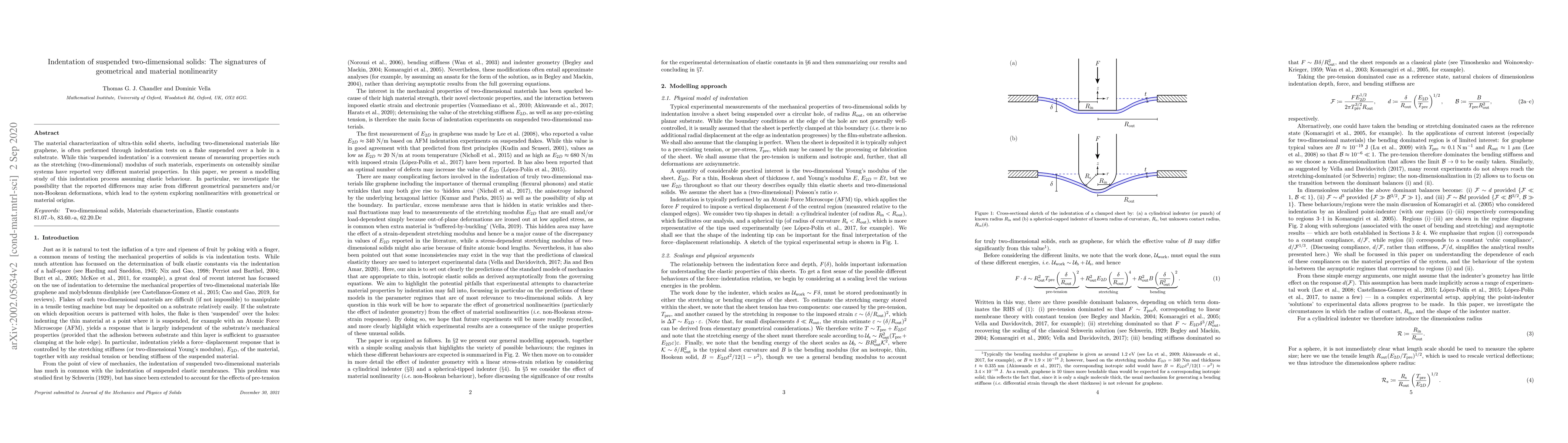 This paper models the indentation of ultra-thin solid sheets, like graphene, suspended over a substrate hole, to explore how geometrical and material nonlinearities affect measured properties. It finds that reported differences in material properties may stem from varying geometrical parameters and non-Hookean deformations.