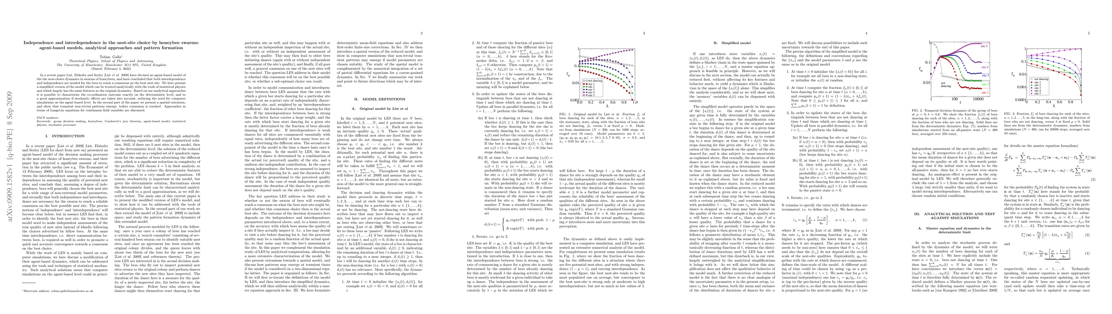 This paper simplifies and analytically analyzes a model of honeybee swarm nest-site choice, showing that both independence and interdependence are crucial for consensus. The study also explores spatial extensions and transient patterns, using statistical physics and Langevin equations.
