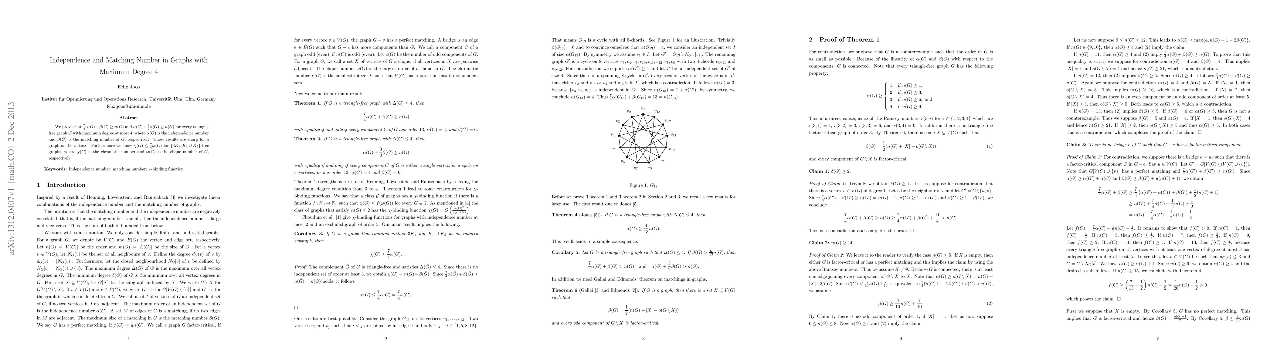 This paper establishes two inequalities for triangle-free graphs with a maximum degree of 4: $\frac{7}{4}\alpha(G)+\beta(G)\geq n(G)$ and $\alpha(G)+\frac{3}{2}\beta(G)\geq n(G)$, where $\alpha(G)$ is the independence number, $\beta(G)$ the matching number, and $n(G)$ the number of vertices. It also proves a chromatic number bound for specific $\{3K_1,K_1\cup K_5\}$-free graphs.