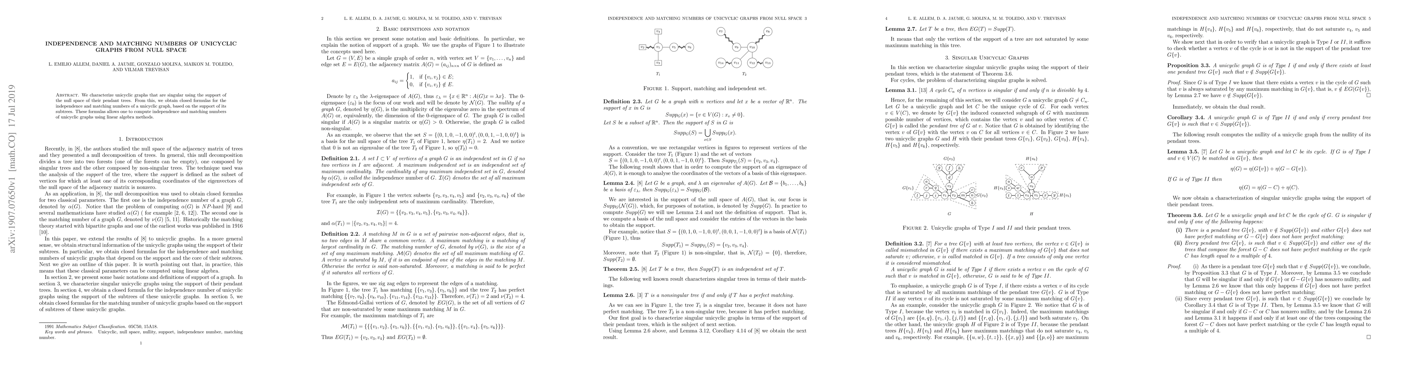 We characterize unicyclic graphs that are singular using the support of the null space of their pendant trees. From this, we obtain closed formulas for the independence and matching numbers of a unicyclic graph, based on the support of its subtrees. These formulas allows one to compute independence and matching numbers of unicyclic graphs using linear algebra methods.