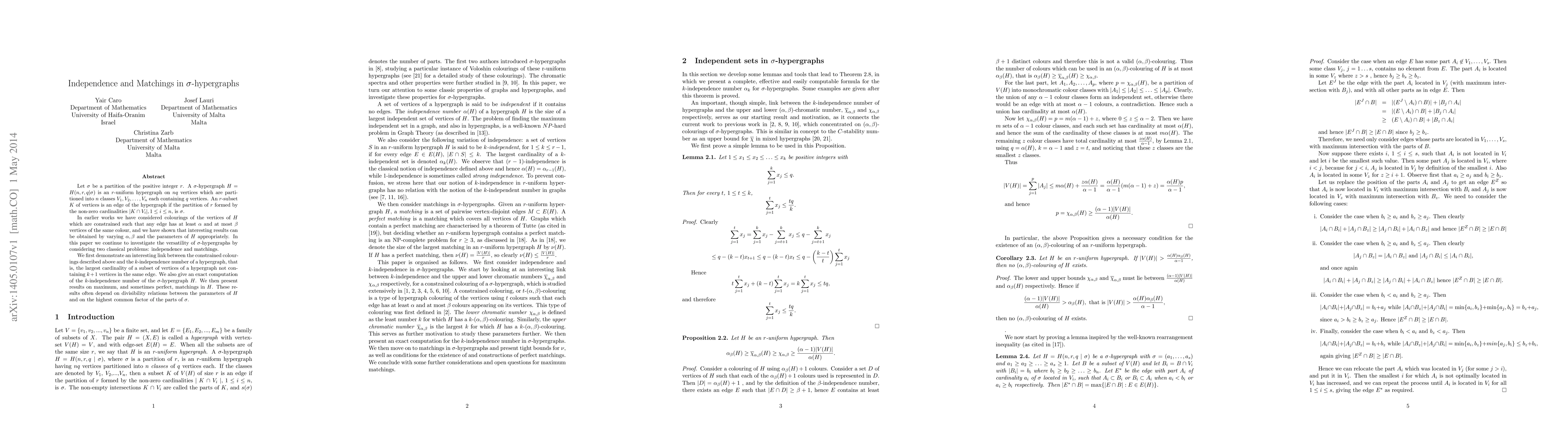Let $\sigma$ be a partition of the positive integer $r$. A $\sigma$-hypergraph $H=H(n,r,q|\sigma)$ is an $r$-uniform hypergraph on $nq$ vertices which are partitioned into $n$ classes $V_1, V_2, \ldots, V_n$ each containing $q$ vertices. An $r$-subset $K$ of vertices is an edge of the hypergraph if the partition of $r$ formed by the non-zero cardinalities $|K\cap V_i|, 1\leq i \leq n,$ is $\sigma$. In earlier works we have considered colourings of the vertices of $H$ which are constrained such that any edge has at least $\alpha$ and at most $\beta$ vertices of the same colour, and we have shown that interesting results can be obtained by varying $\alpha, \beta$ and the parameters of $H$ appropriately. In this paper we continue to investigate the versatility of $\sigma$-hypergraphs by considering two classical problems: independence and matchings. We first demonstrate an interesting link between the constrained colourings described above and the $k$-independence number of a hypergraph, that is, the largest cardinality of a subset of vertices of a hypergraph not containing $k+1$ vertices in the same edge. We also give an exact computation of the $k$-independence number of the $\sigma$-hypergraph $H$. We then present results on maximum, and sometimes perfect, matchings in $H$. These results often depend on divisibility relations between the parameters of $H$ and on the highest common factor of the parts of $\sigma$.