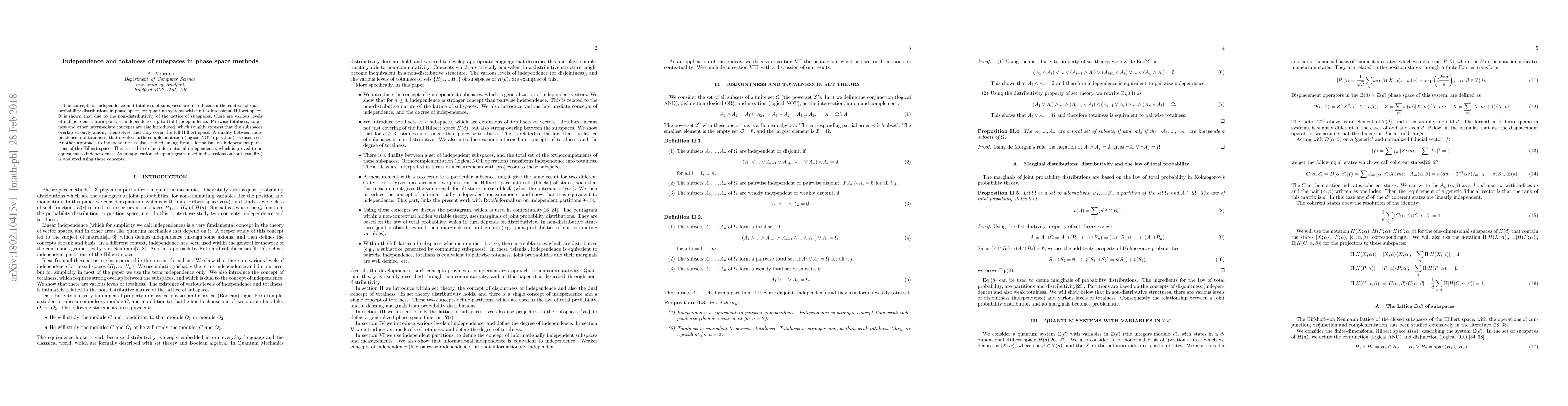 The concepts of independence and totalness of subspaces are introduced in the context of quasi-probability distributions in phase space, for quantum systems with finite-dimensional Hilbert space. It is shown that due to the non-distributivity of the lattice of subspaces, there are various levels of independence, from pairwise independence up to (full) independence. Pairwise totalness, totalness and other intermediate concepts are also introduced, which roughly express that the subspaces overlap strongly among themselves, and they cover the full Hilbert space. A duality between independence and totalness, that involves orthocomplementation (logical NOT operation), is discussed. Another approach to independence is also studied, using Rota's formalism on independent partitions of the Hilbert space. This is used to define informational independence, which is proved to be equivalent to independence. As an application, the pentagram (used in discussions on contextuality) is analyzed using these concepts.
