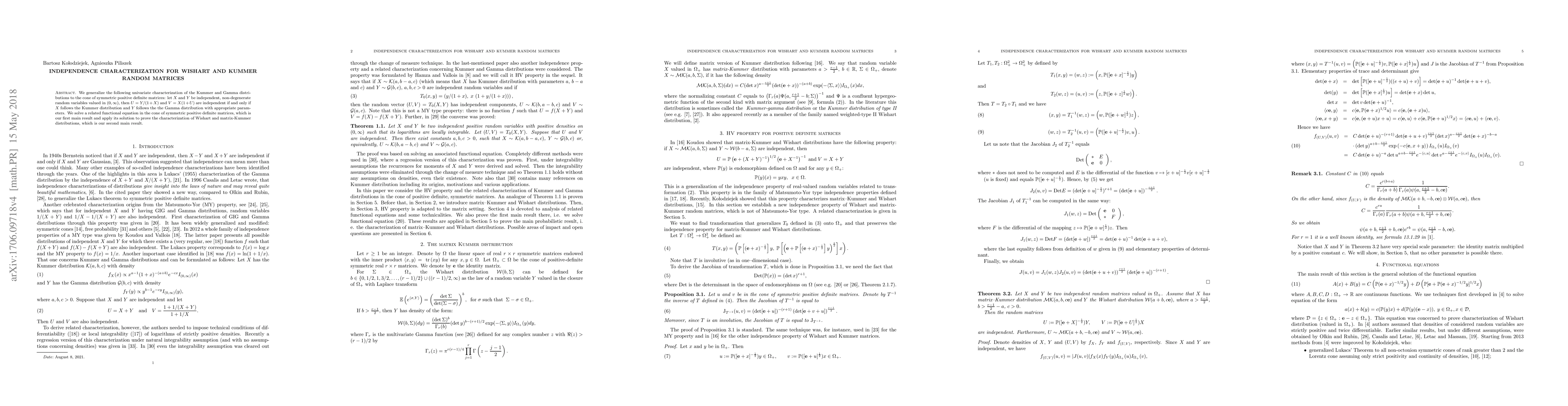 We generalize the following univariate characterization of the Kummer and Gamma distributions to the cone of symmetric positive definite matrices: let $X$ and $Y$ be independent, non-degenerate random variables valued in $(0, \infty)$, then $U= Y/(1+X)$ and $V = X(1+U)$ are independent if and only if $X$ follows the Kummer distribution and $Y$ follows the the Gamma distribution with appropriate parameters. We solve a related functional equation in the cone of symmetric positive definite matrices, which is our first main result and apply its solution to prove the characterization of Wishart and matrix-Kummer distributions, which is our second main result.