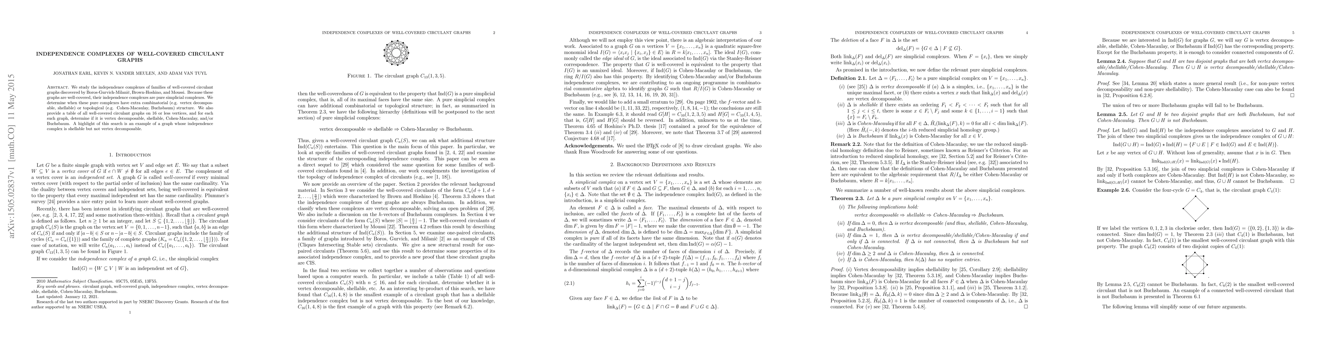 This paper investigates the independence complexes of well-covered circulant graphs, determining their combinatorial and topological properties, and provides a comprehensive table of such graphs with 16 or fewer vertices, identifying specific structures like vertex decomposability and shellability. It highlights a unique case where shellability does not imply vertex decomposability.